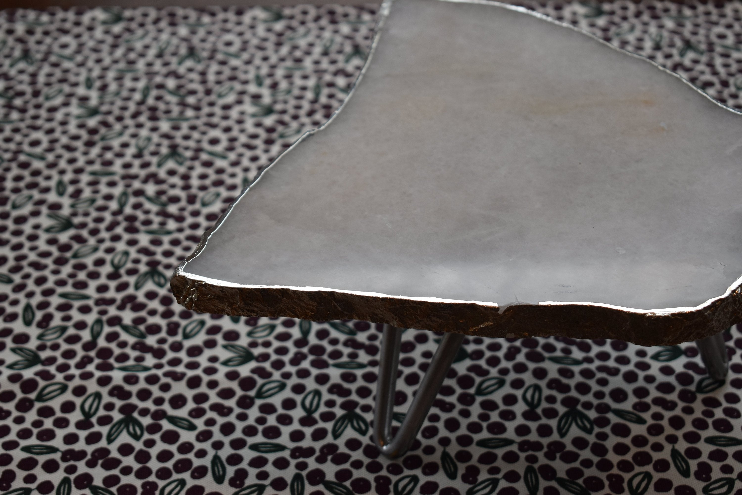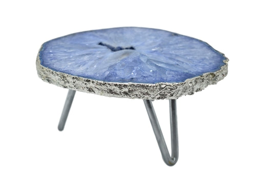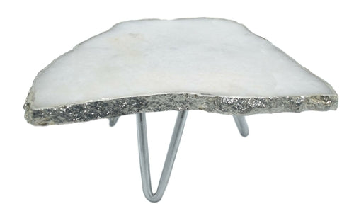 Elevate your confectionary creations by displaying them on a gemstone cake stand with silver trim. Each specimen is completely unique and blends seamlessly with any decor. Choose from classy white quartz or pastel blue agate surrounded by a band of silver. These pieces stand 5-inches tall on three silver legs attached to the base.Β