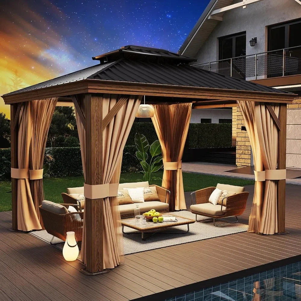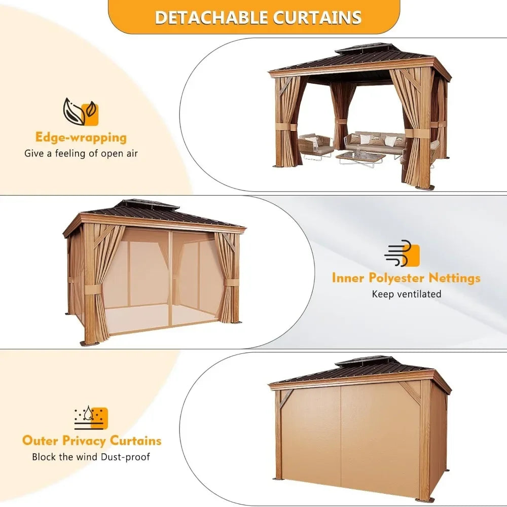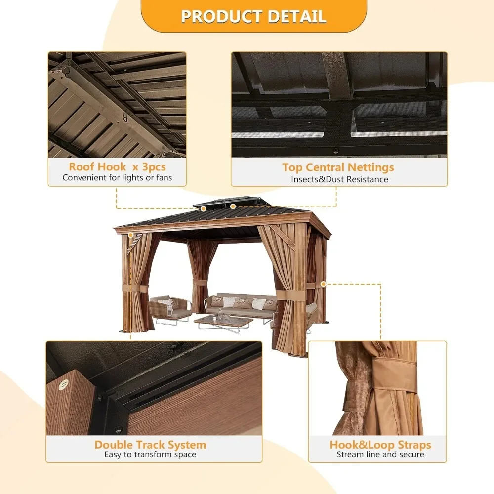 Galvanized Steel Dual-Layer Top:This roof of the hardtop gazebo is made by powder-coated galvanized steel, which is less prone to rust or corrosion. Also, it is durable and sturdy enough to challenge bad weathers