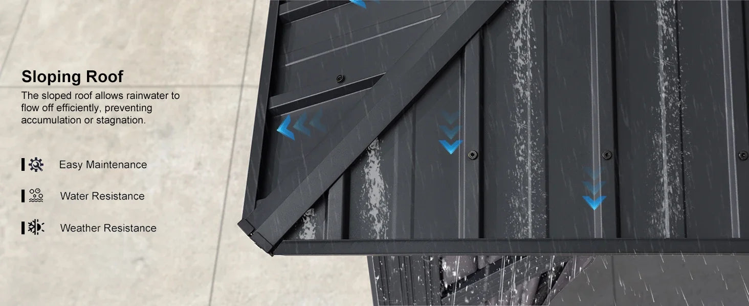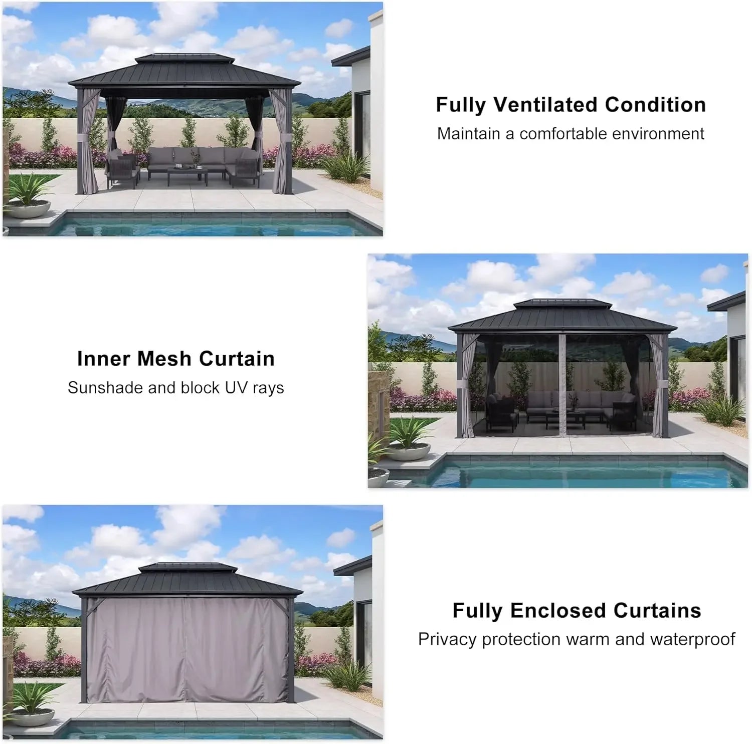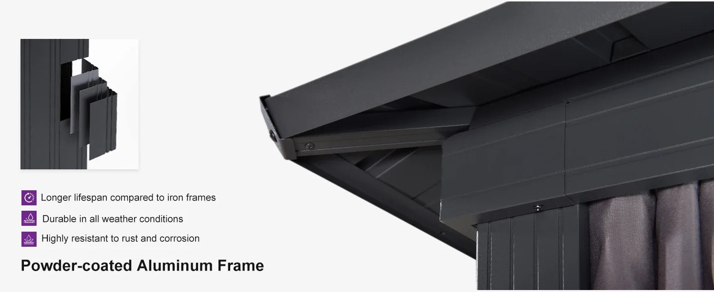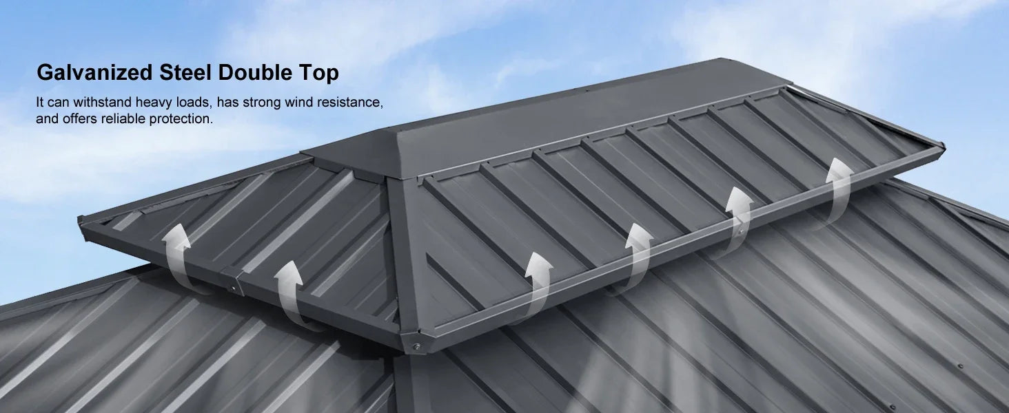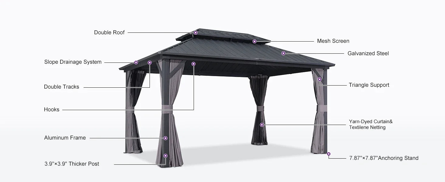 Experience the robust galvanized steel double-roof structure, offering superior waterproofing and sun protection. It includes a slope drainage system for effortless upkeep, along with polyester curtains and Textilene netting to create a private and peaceful retreat.