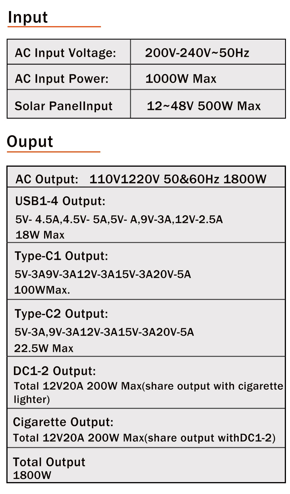 AC output: 1600W 110V / 1800W 220V 50&60Hz