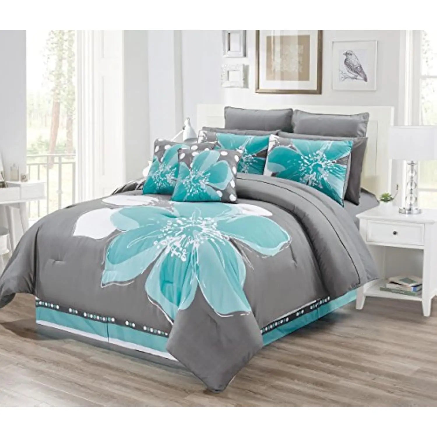 12 - Piece Aqua Blue, Grey, White Floral Bed-in-a-Bag (Double) Full Size Bedding + Sheets + Accent Pillows Comforter Set