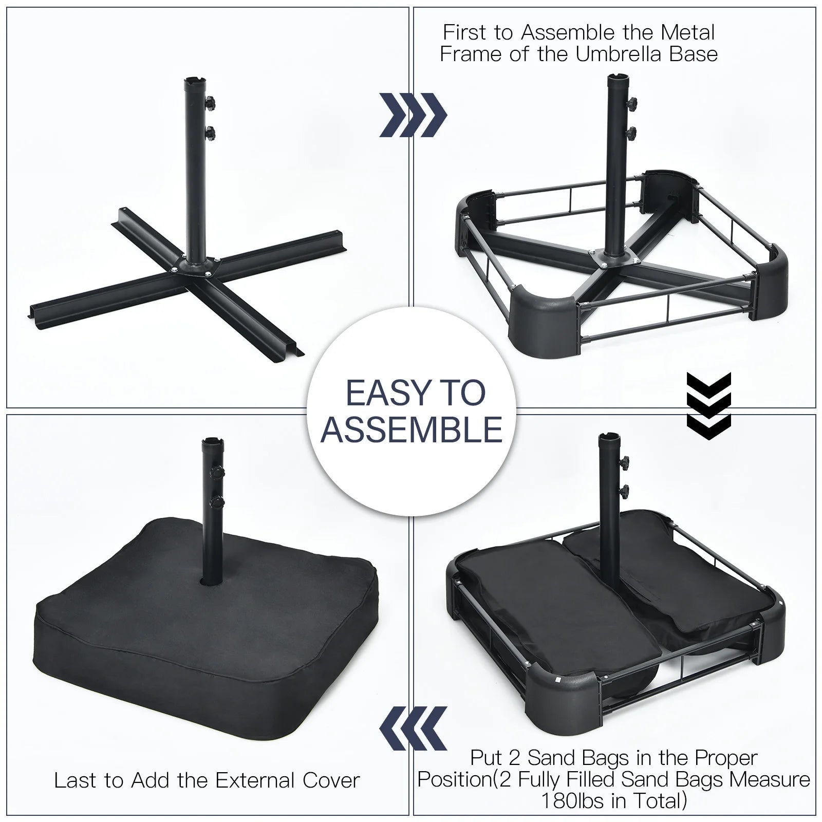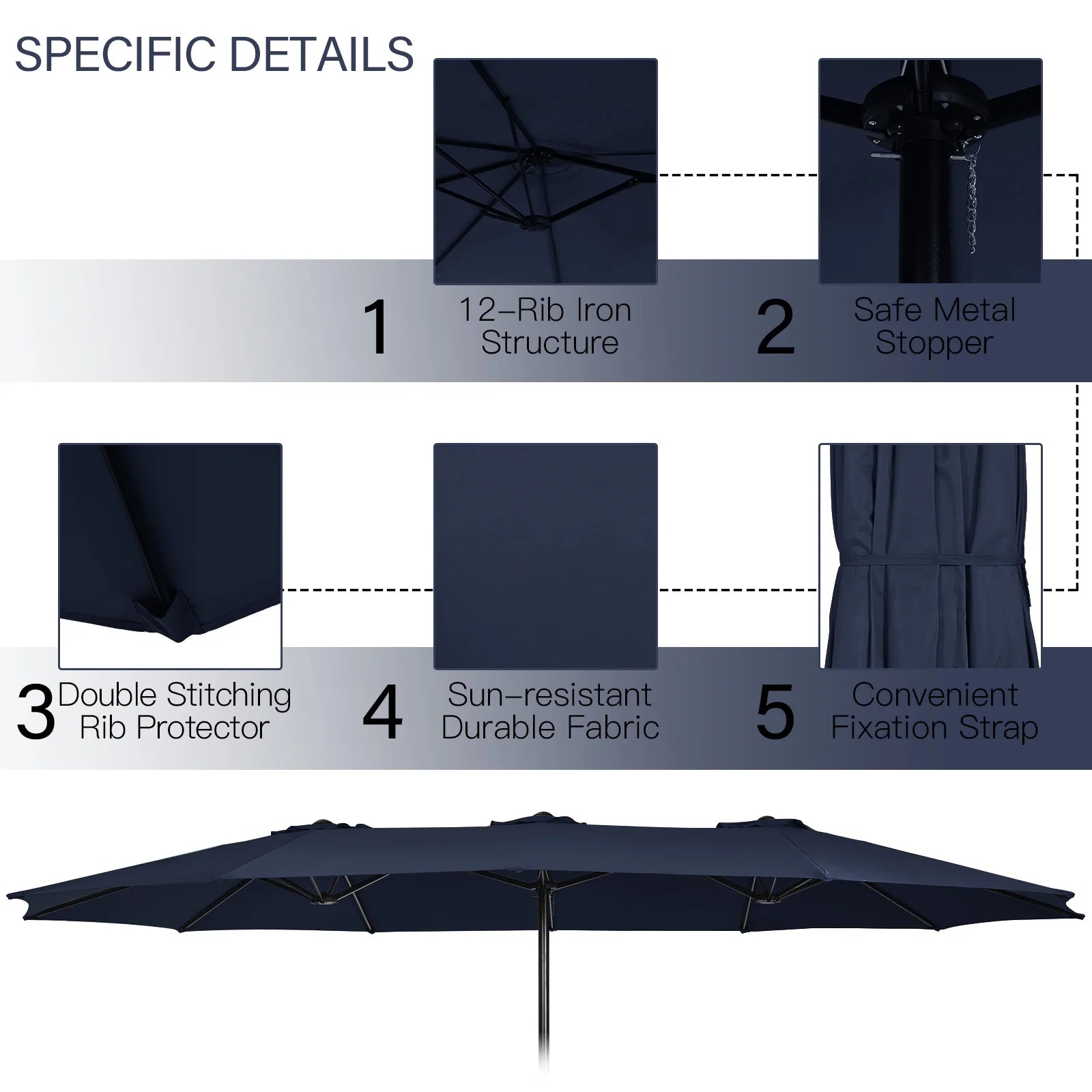 Measuring 15ft x 9ft, this double-sided umbrella provides a wide coverage of shade to allow several people getting together to chat under sunny days. Besides, the patio umbrella comes with sturdy metal structure and sun-protective fabric, which can ensure high durability and protection. And the bottom base is constructed with a crossed metal frame, 2 sand bags (a filled sand bag weighs 90lbs) and an external cover, so you don't need to buy an enhanced base additionally. Furthermore, this outside patio umbrella has user-friendly crank mechanism that helps you to open and close the umbrella with ease by rotating the crank handle. In a word, our patio twin umbrella is perfect for outdoor use, such as backyard, garden, poolside and fairground.