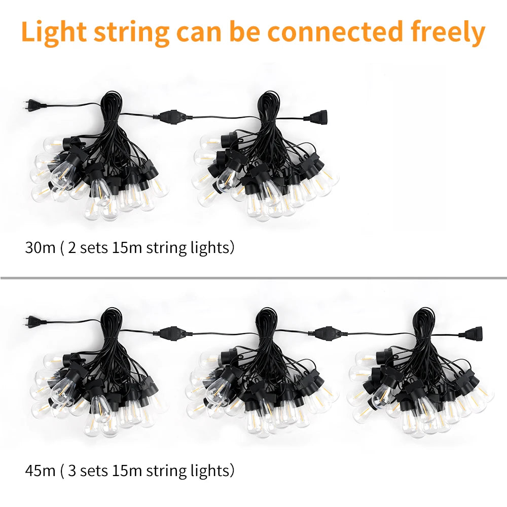 3.Dimmable and connectable: LED fairy lights outside main cable are perfectly compatible with a dimmer (dimmer not included) and you can change the brightness through the dimmers to create a very nice atmosphere on your patio or outdoors. 4.These LED outdoor fairy lights are connected in parallel and can be connected to up to 28 strands, even if any remaining LED filaments continue to light up in the event of a defective or removed LED filament.