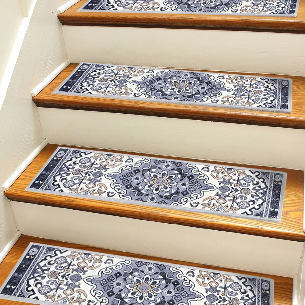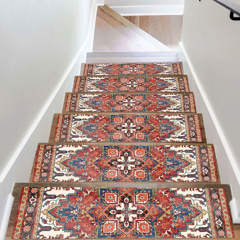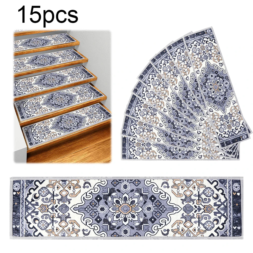 15PCS Carpet Stair Treads Set Self-adhesive Backing Non Slip Indoor Stair Rugs Reusable Stairway Carpet Rugs Bohemian Indoor Skid Resistant Stair Tread for Wooden Steps for Dogs Kids & Elder
