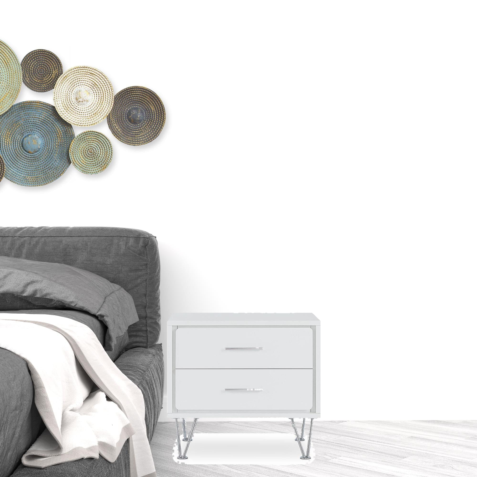 Your bedroom or dressing room can get trendier with this stylish and highly functional nightstand. Our nightstand combines beauty and versatility to help get your room organized as well as brighten the atmosphere. It features two wooden drawers with glide side metal that serve as a perfect storage space for your personal essentials. The rectangular top will be an ideal place to position your table lamp or flower pot. The white top combines well with the chrome V-shape metal legs to make this piece awesome addition to your living space. 19.69inches X 15.75inches X 17.93inches