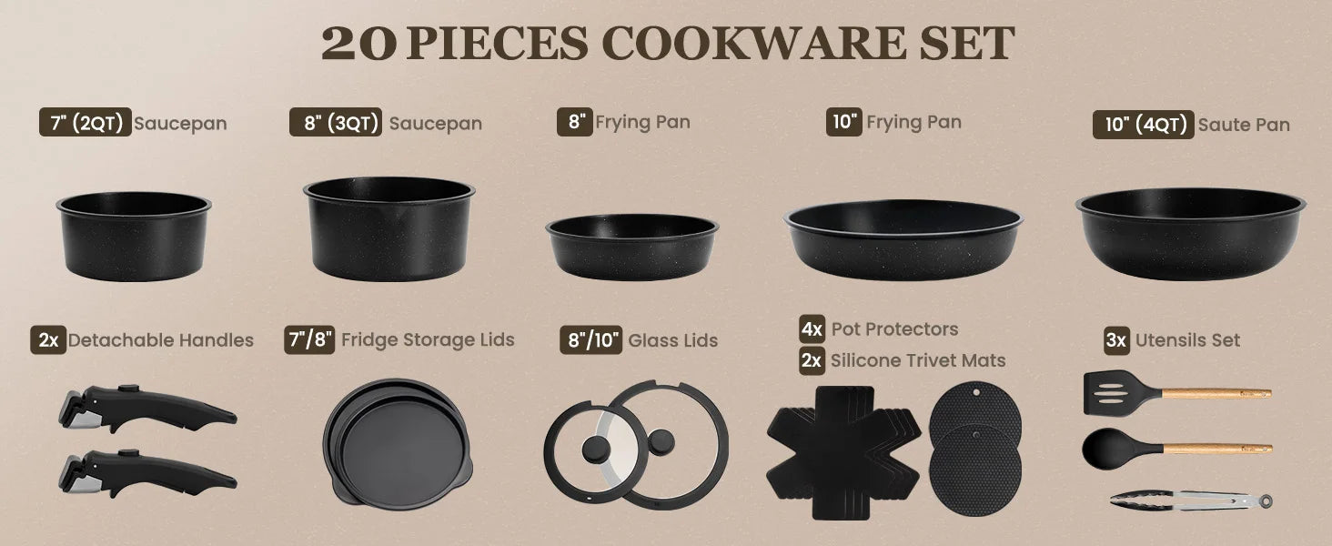 The KIKCOIN Detachable Handle Cookware Set will impress you not only with its LONG-LASTING quality, but also with its FLEXIBILITY and SPACE SAVING design.