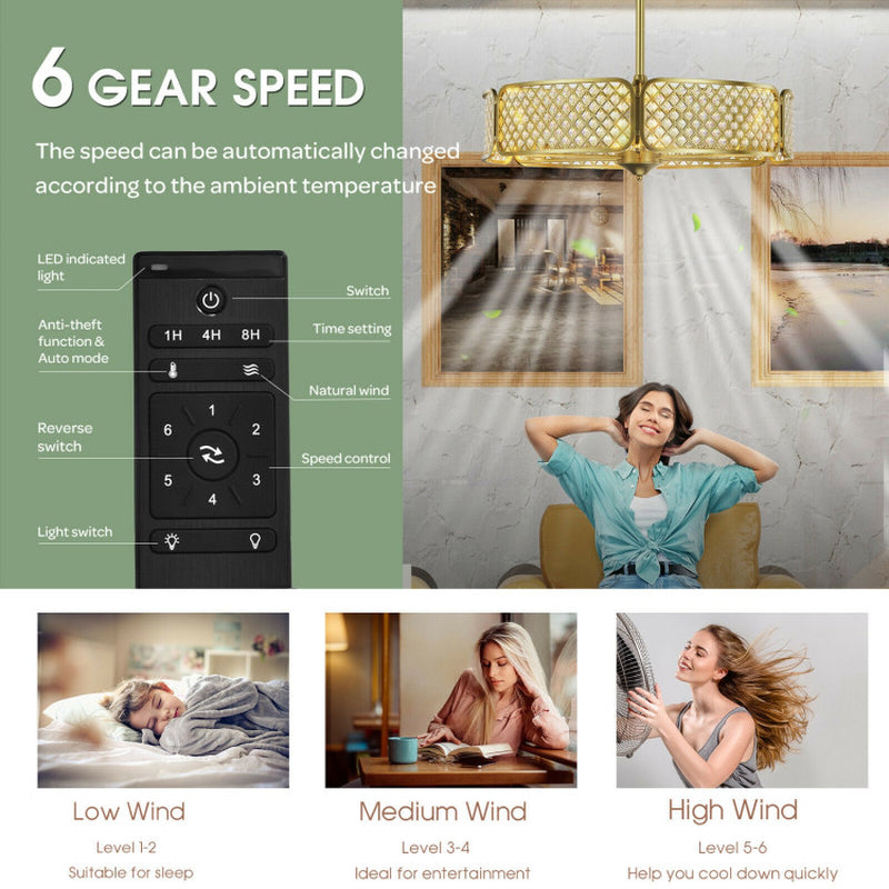 This stylish ceiling fan not only meets your cooling and lighting needs but also serves as a beautiful overhead decoration. With its 6-speed functionality and remote control for convenient operation, this fan is perfect for any season. The reversible motor allows for year-round use, providing cool air in the summer and circulating warmth in the winter. If you're looking to elevate your interior while enjoying high utility, this ceiling fan is the perfect choice. Don't waitβorder yours today!