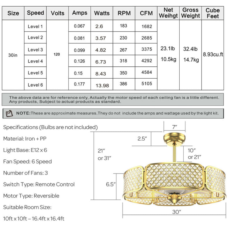 This exquisite 30-inch ceiling fan combines elegance and functionality, making it the perfect addition to your home decor. With its stunning crystal light feature and versatile design, it enhances the ambiance of any room while providing efficient cooling and lighting. Ideal for living rooms, dining areas, and bedrooms, this ceiling fan is a must-have for style and comfort.