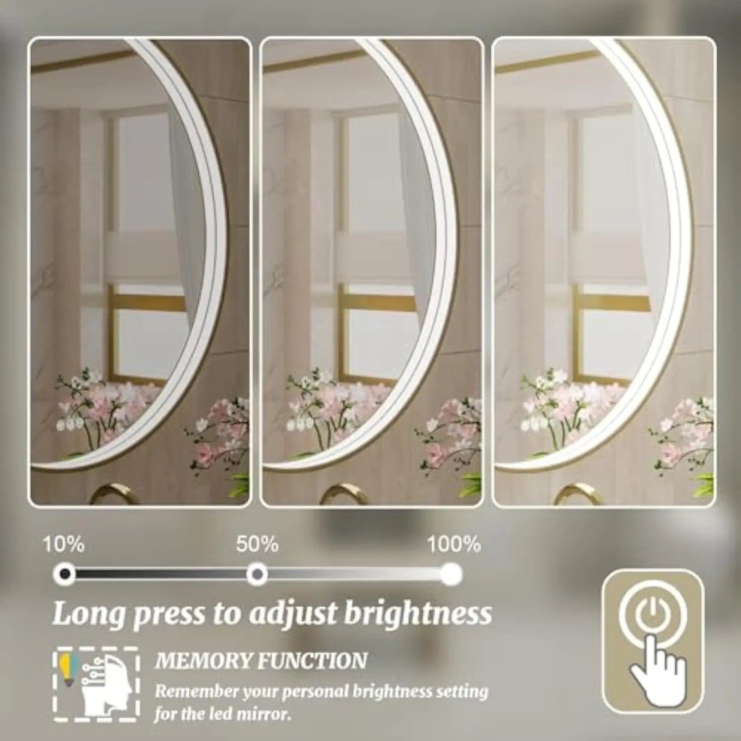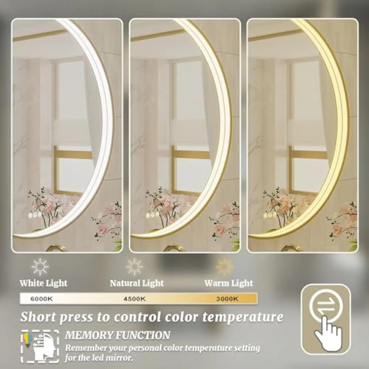 【gold brushed frame led round mirror】the led round mirror for bathroom with brushed metal aluminum alloy frame, strong bearing capacity protects led mirror,并具有良好的防腐和防锈效果。 Led gold frame mirror prefect to use in bathroom, powder room, hair salon, hotel, clothing store, hall, etc., 【3 color temperature & dimmable】the 3 color temperature of this led bathroom vanity mirror is free to adjust for your needs, 3000k-6000k, warm light/natural light/white light. Led bathroom mirror with lights come with memory function, you can remember the color temperature and brightness state of you previous use. 【anti-fog & hd eco-friendly mirror】this smart led mirror is defog fast and safe. One click to fast defogging and will auto-off after one hour. Led vanity mirror with hd eco-friendly copper-free glass, hd reflection with no distortion. 【plug in/hardwired】 wall mounted lighted bathroom mirrors can be directly connected to a plug or hardwired support wall switch. If you choose hardwired to use wall switch,建议使用 professional electrician to install the lighted mirror. 【100% satisfied with after-sales service】if the bathroom led mirror is damaged or broken, you will have a 100% satisfactory solution. The lighted mirrors for bathroom wall pass drop and impact test for shipment to ensure mirror transportation safety.
