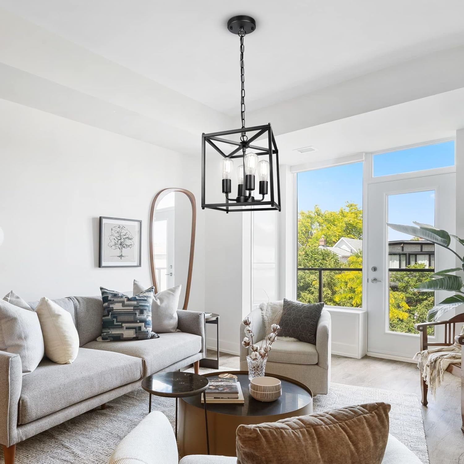 Enhance your home decor with the Rustic 4-Light Black Lantern Chandelier, a stunning blend of farmhouse charm and modern elegance. This exquisite lighting fixture features a captivating geometric design, making it a perfect focal point for any space.
