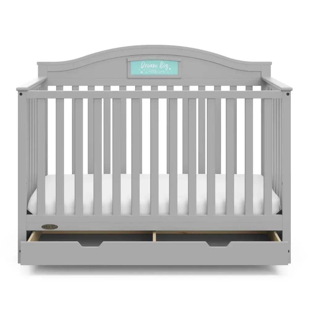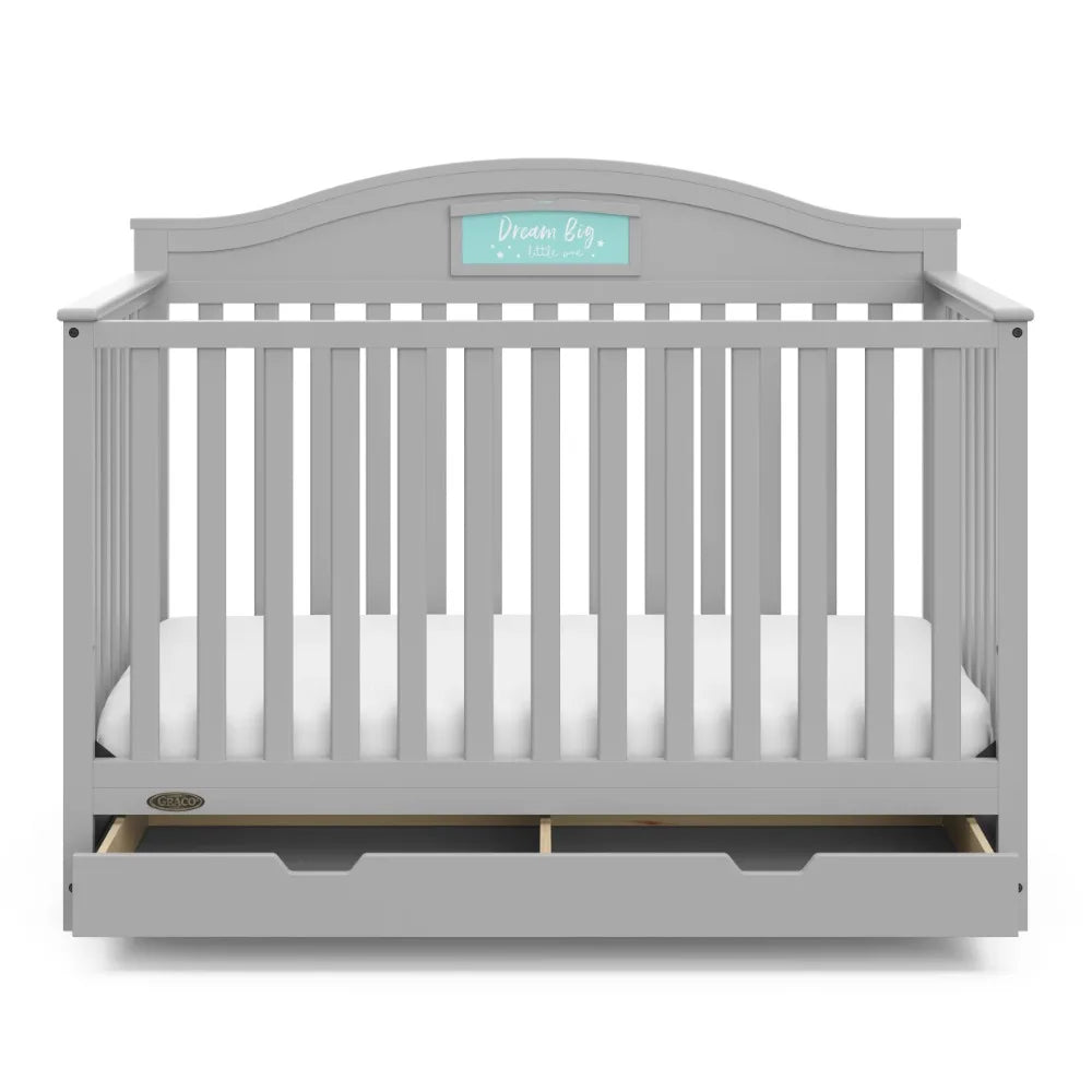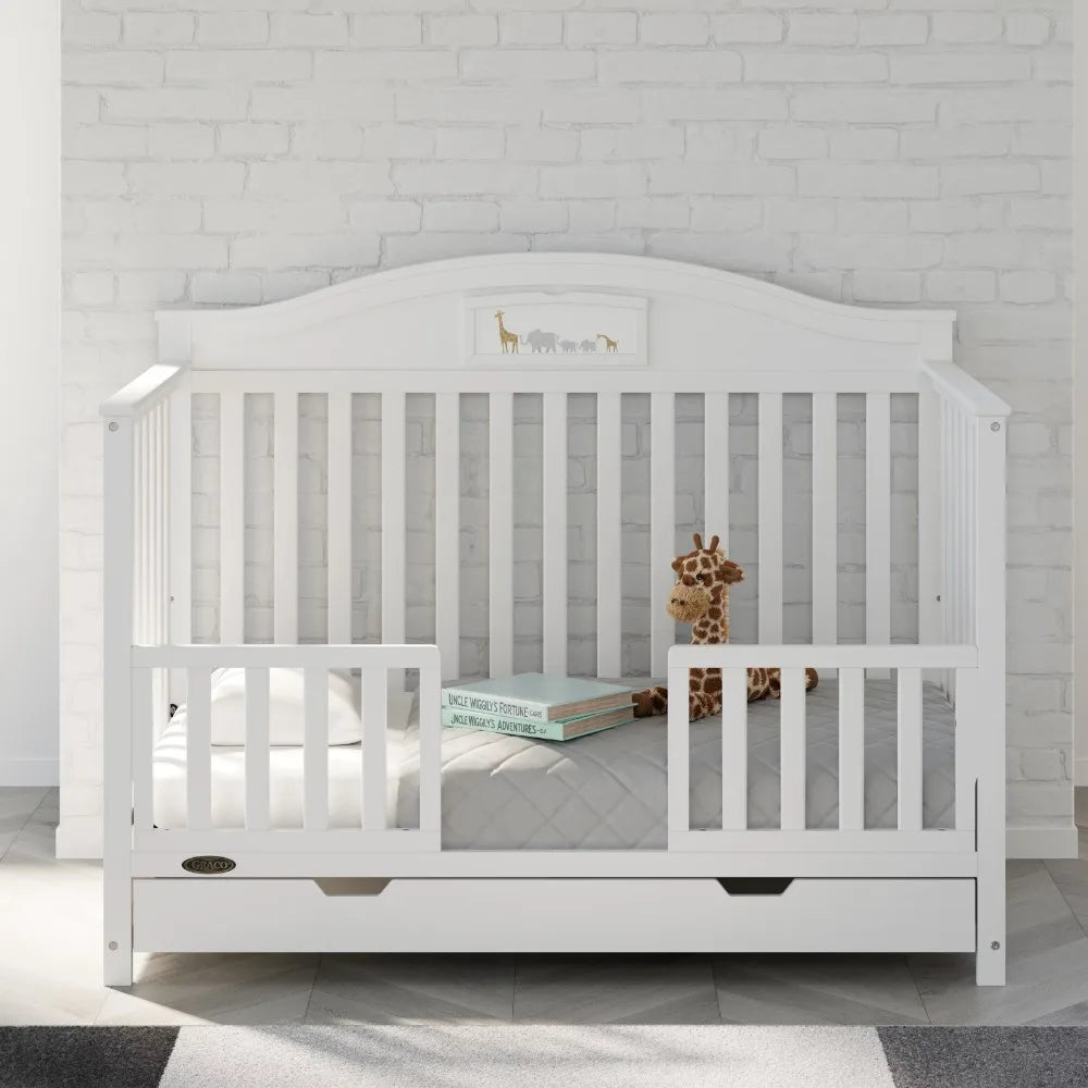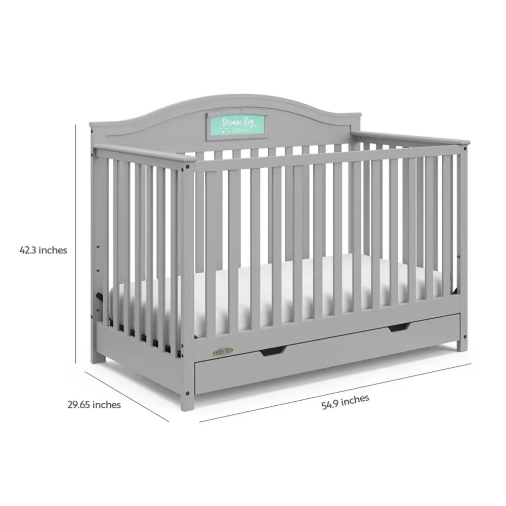 - 5-IN-1 CONVERTIBLE CRIB WITH DRAWER: Converts from baby crib (mattress sold separately) to toddler bed (compatible with 1 or 2 toddler guardrails, each sold separately), daybed, and full-size bed with headboard & optional footboard (compatible full-size conversion kit sold separately)