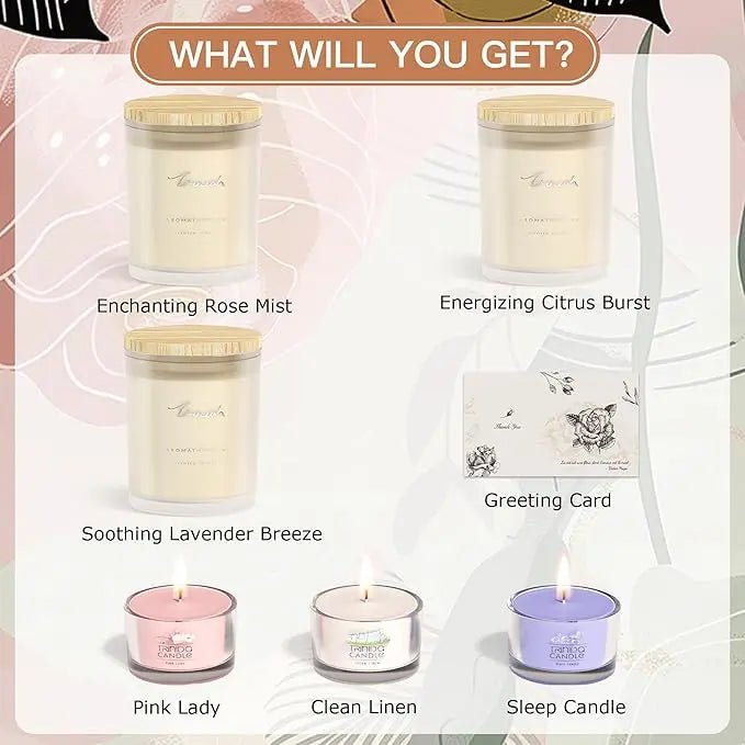 Complete Fragrance Journey: 3 Full-Size: Rose Mist (floral), Citrus Burst (energizing), Lavender Breeze (calming) | 3 Minis: Pink Lady (romantic), Clean Linen (fresh), Sleep Candle (sleep aid) + greeting card