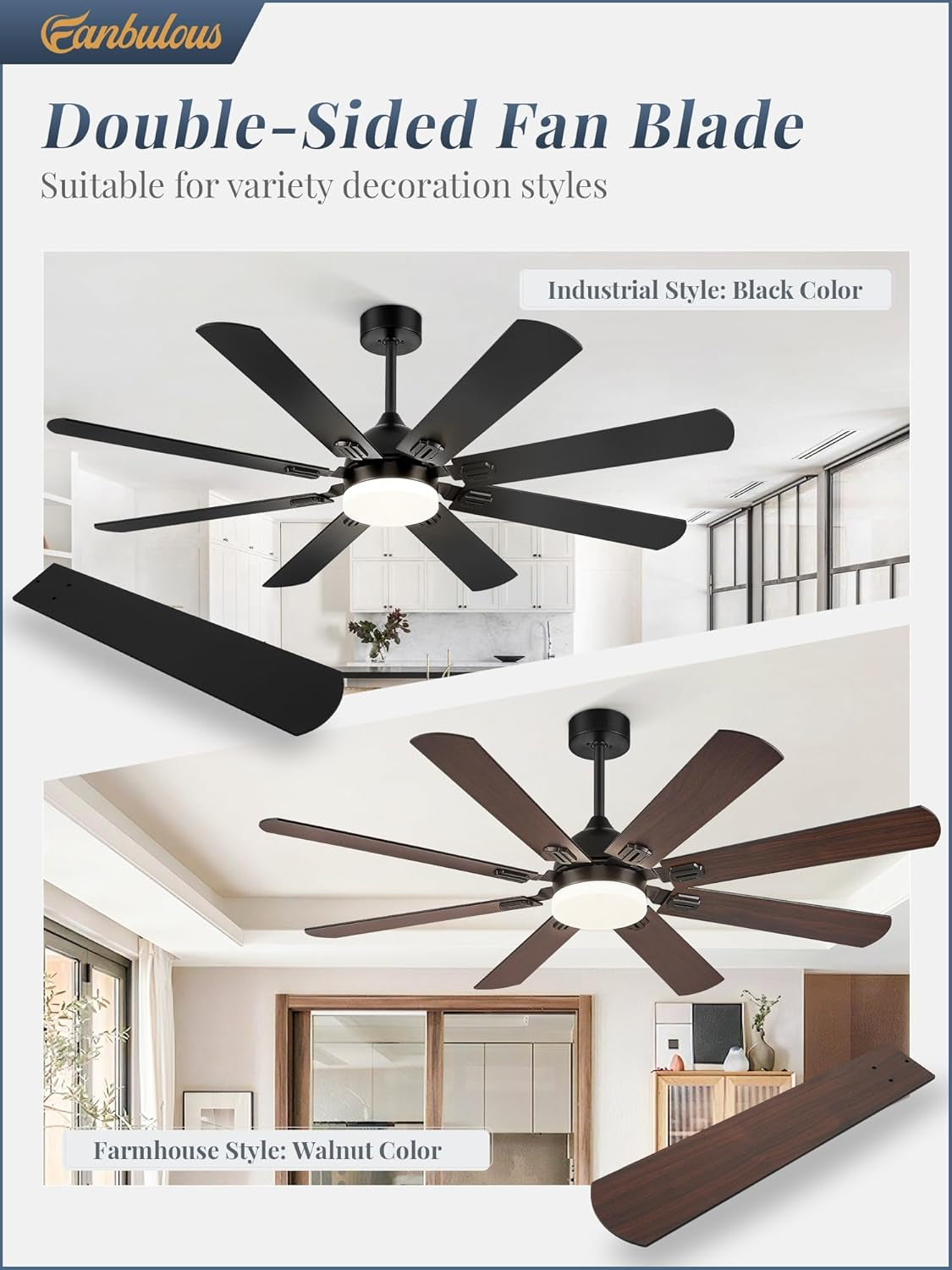 Experience the perfect blend of modern elegance and vintage charm with our 62-Inch Ceiling Fan. Designed with a unique dual-sided feature, this fan showcases stunning black and walnut blades that enhance any décor style. With its powerful airflow and versatile installation options, it’s ideal for various indoor and outdoor spaces.