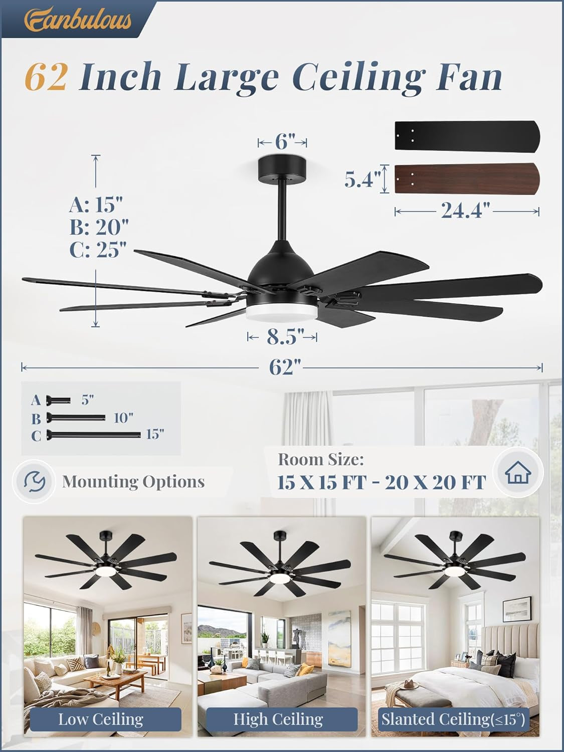 Transform your living room, lounge, bedroom, or patio with this versatile, stylish ceiling fan. Enjoy the perfect atmosphere year-round with the Sleek 62-Inch Ceiling Fan with Remote and Lights.