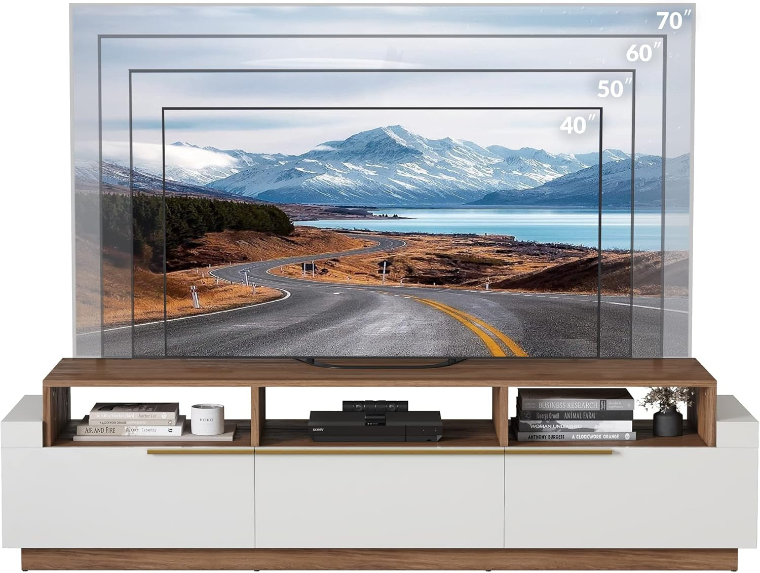 Elevate your living space with our Stylish 70" Modern TV Stand, designed to blend seamlessly with a variety of decor themes. This chic credenza features a contemporary aesthetic with mixed color accents and golden alloy handles, making it the perfect centerpiece for your entertainment area.