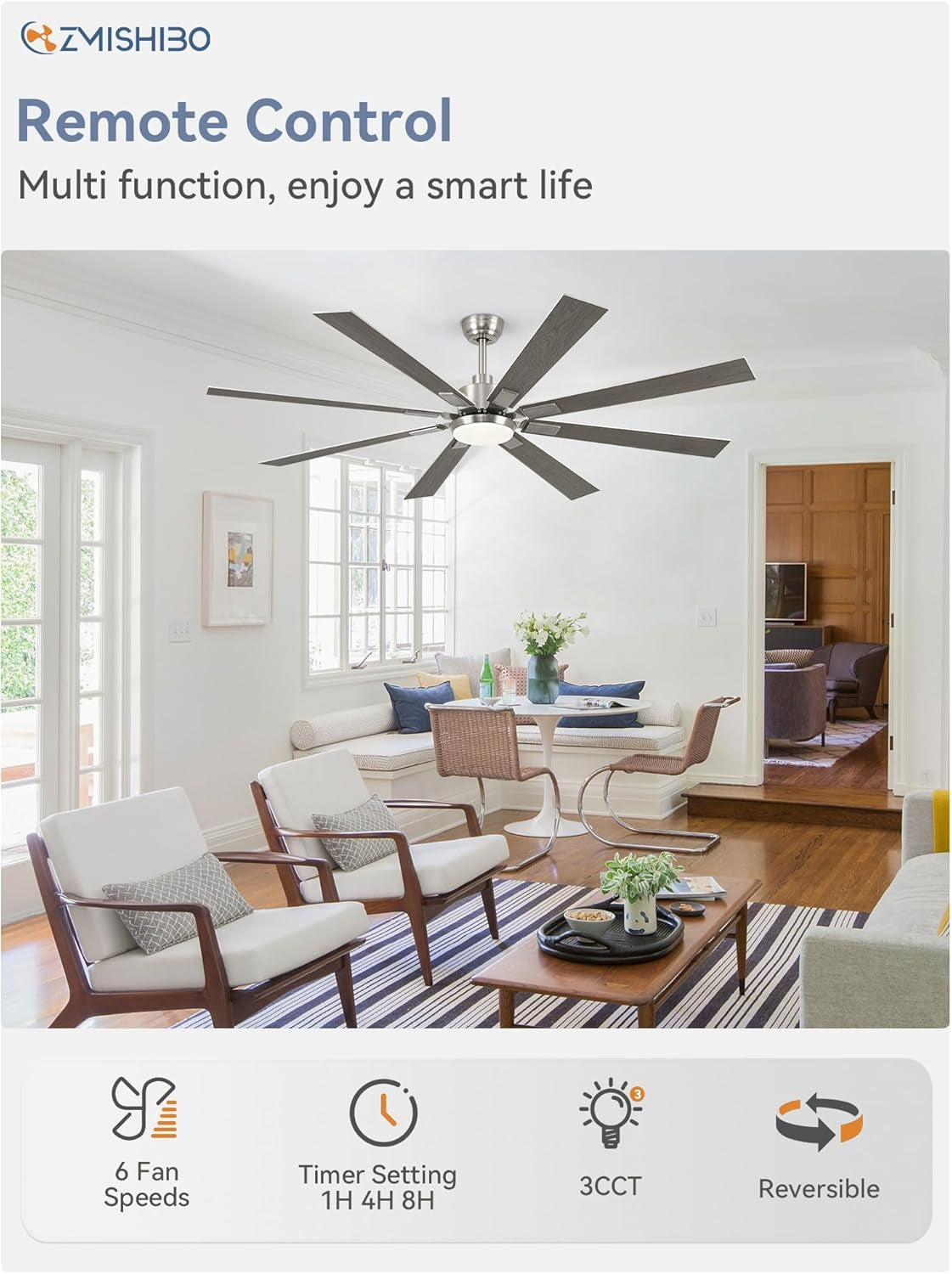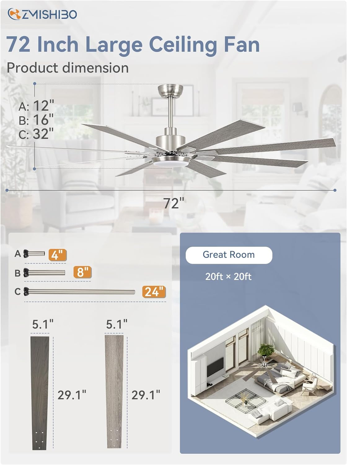 Enhance your space with the Modern 72-Inch Ceiling Fan, a perfect blend of style and functionality. This versatile ceiling fan features a sleek dual-color design, making it an ideal choice for both low and high ceilings, ranging from 12 to 32 inches. With its powerful performance and eye-catching aesthetics, it’s suitable for various settings including living rooms, garages, barns, and covered patios.