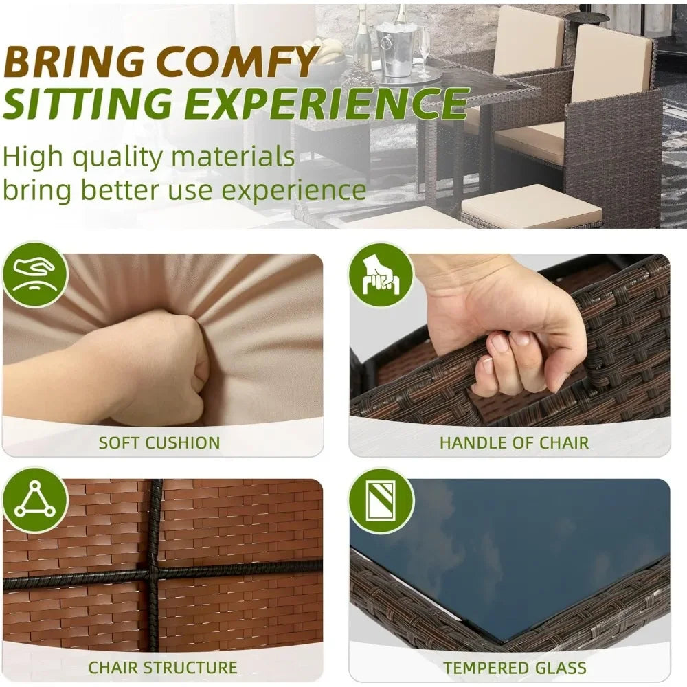9 Pieces Patio Dining Sets Outdoor Conversation Sets, Space Saving Wicker Chairs with Glass Table and Ottomans,Cushioned Seating