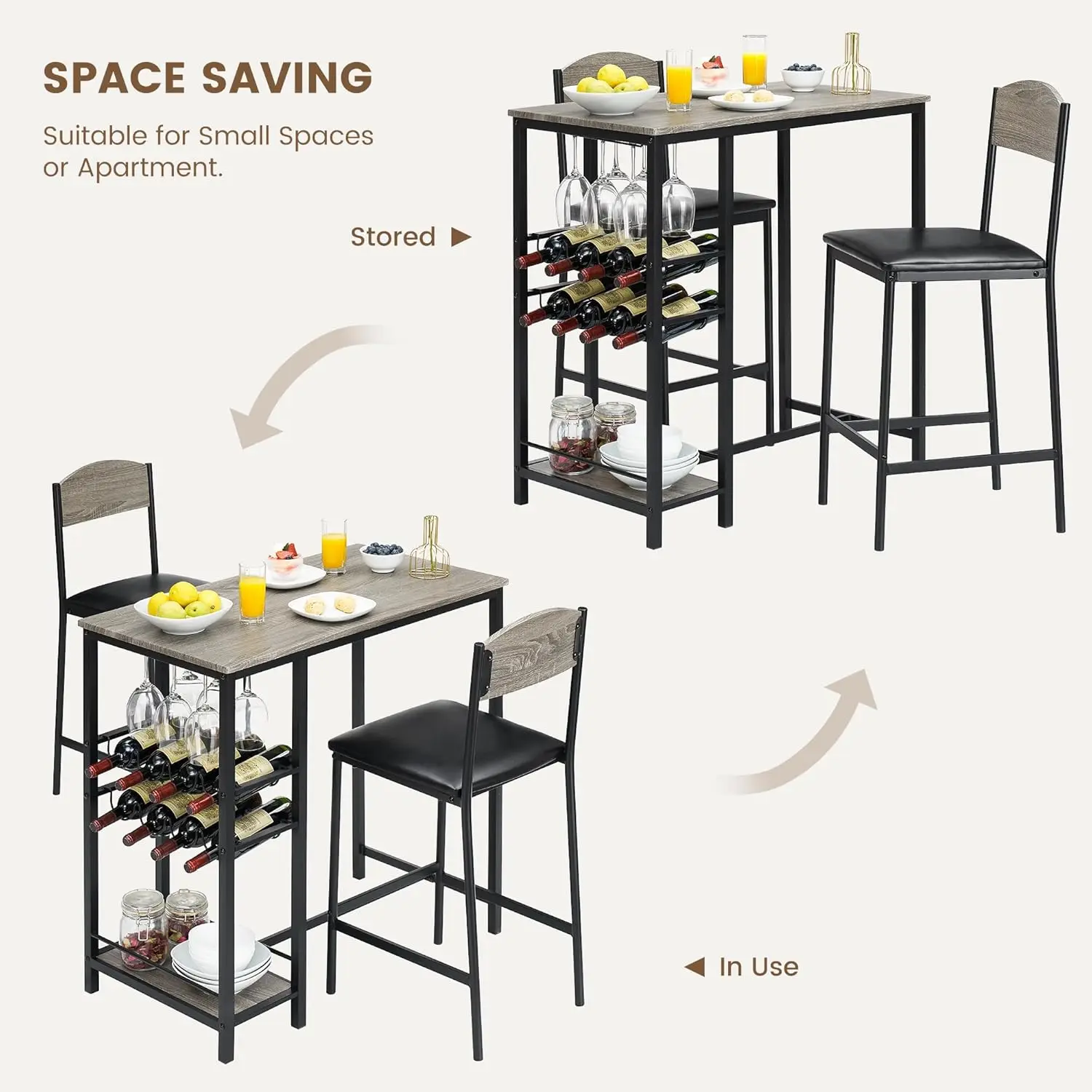 The bar table and chairs have an elegant style, you can place them in the kitchen or living room, adding a touch of sophistication during meal times