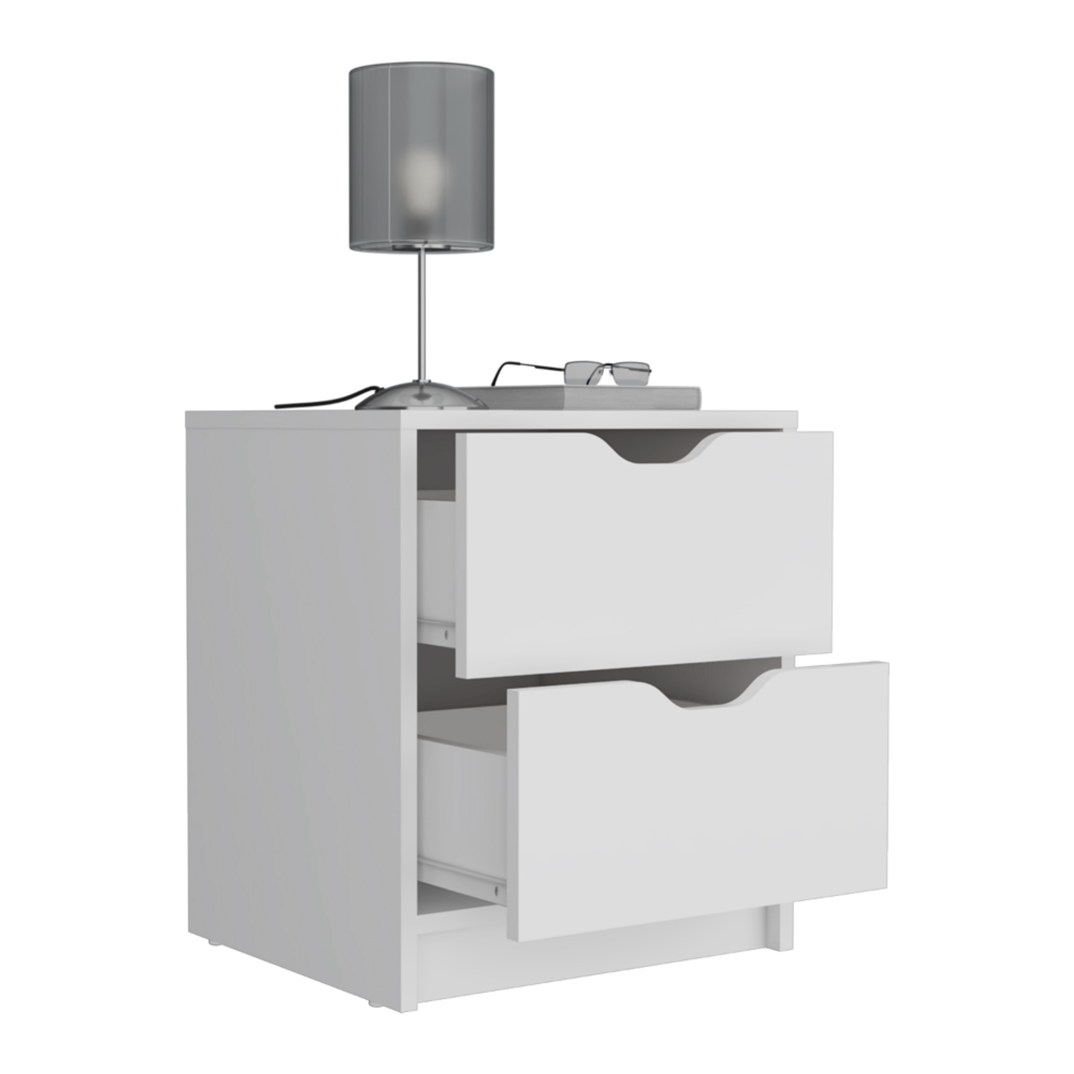 Crafted with a sleek modern design, the Basilea Nightstand features two spacious drawers that offer ample storage for clothing, books, personal belongings, and other essentials. Each drawer comes equipped with a convenient pull-out system, ensuring easy access and organization