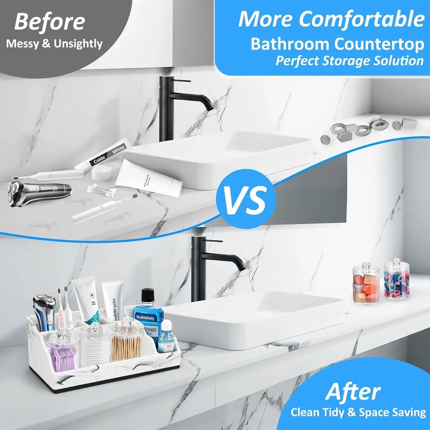 Bathroom Countertop Organizer - The large capacity bathroom toothbrush holder is designed to keep your bathroom counter neat and organized. Marble bathroom organizer countertop is designed in 2 tiers with 5 slots and 3pcs qtip holder dispenser, which is large capacity. The design is simple yet effective, with 5 well-spaced slots that holds everything you need it to. Such as toothbrush, toothpaste, dental floss, razor, hairbrush, makeup brush, spray, skincares, makeup, lotions and other bathroom accessories, keeping your bathroom countertop clean, clear and free of clutter. The 3pcs qtip holder dispenser can put cotton ball, cotton swab and floss picks, tampon ect.