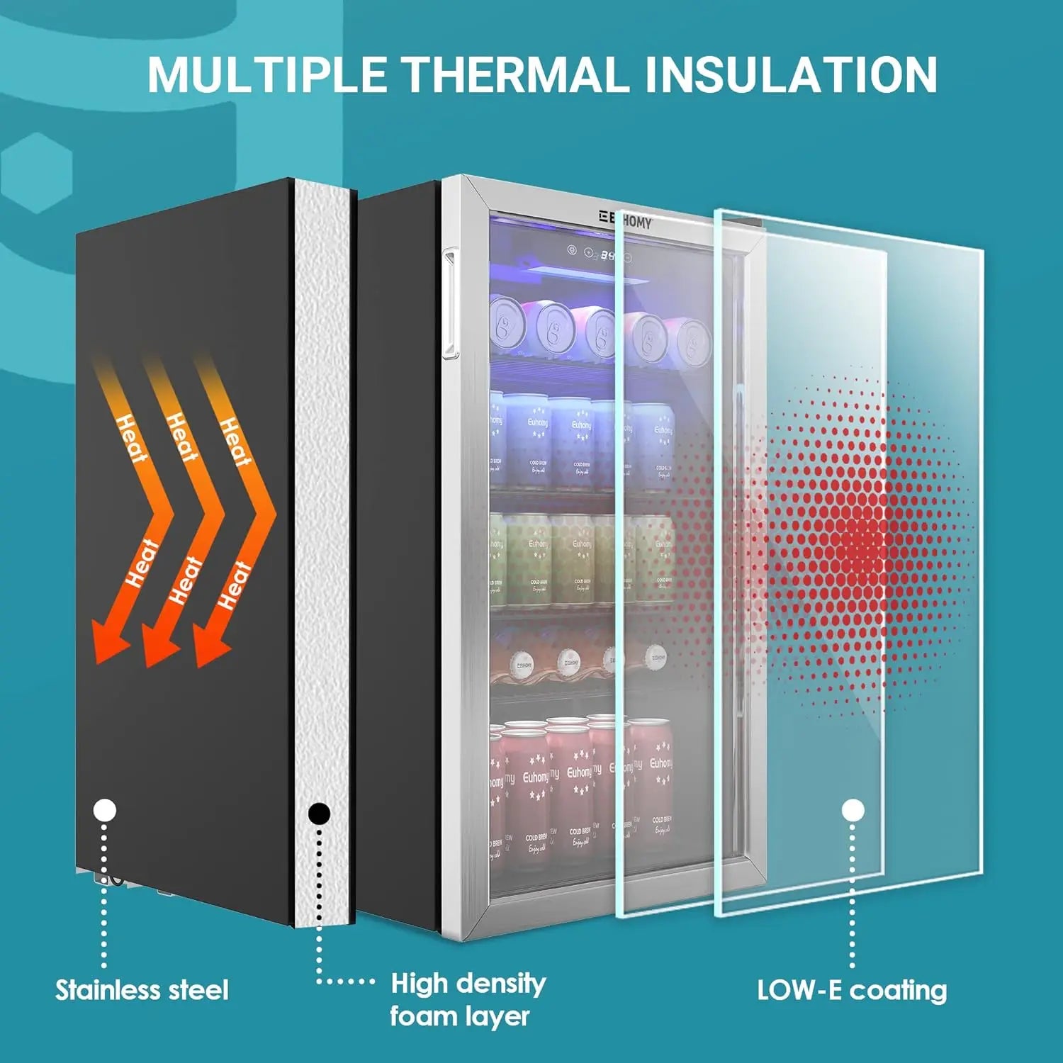 QUIET + ADVANCED COOLING SYSTEM - With a powerful compressor and internal air-cooled system, mini fridge creates an evenly cooled space by ensuring that air flows throughout the entire beverage center.In addition, ultra quiet cooler of beverage cooling machine doesn't affect your daily rest or working. With our cooler, you won't just enjoy cold drinks, you'll have a quiet environment too.