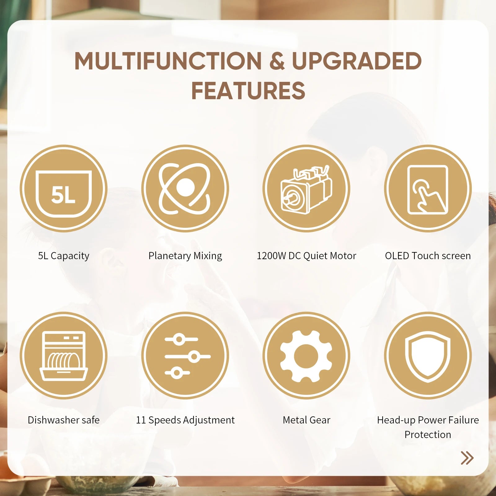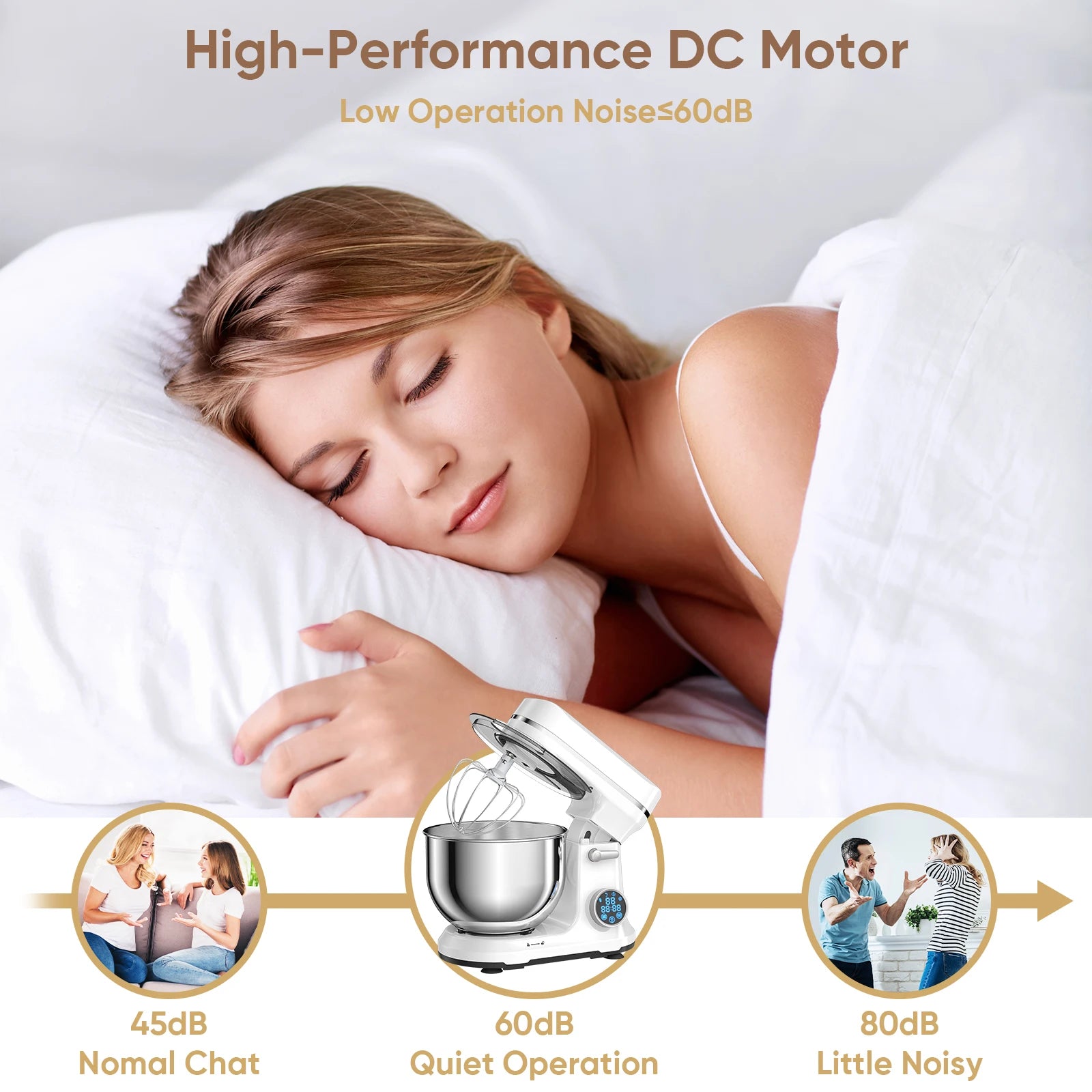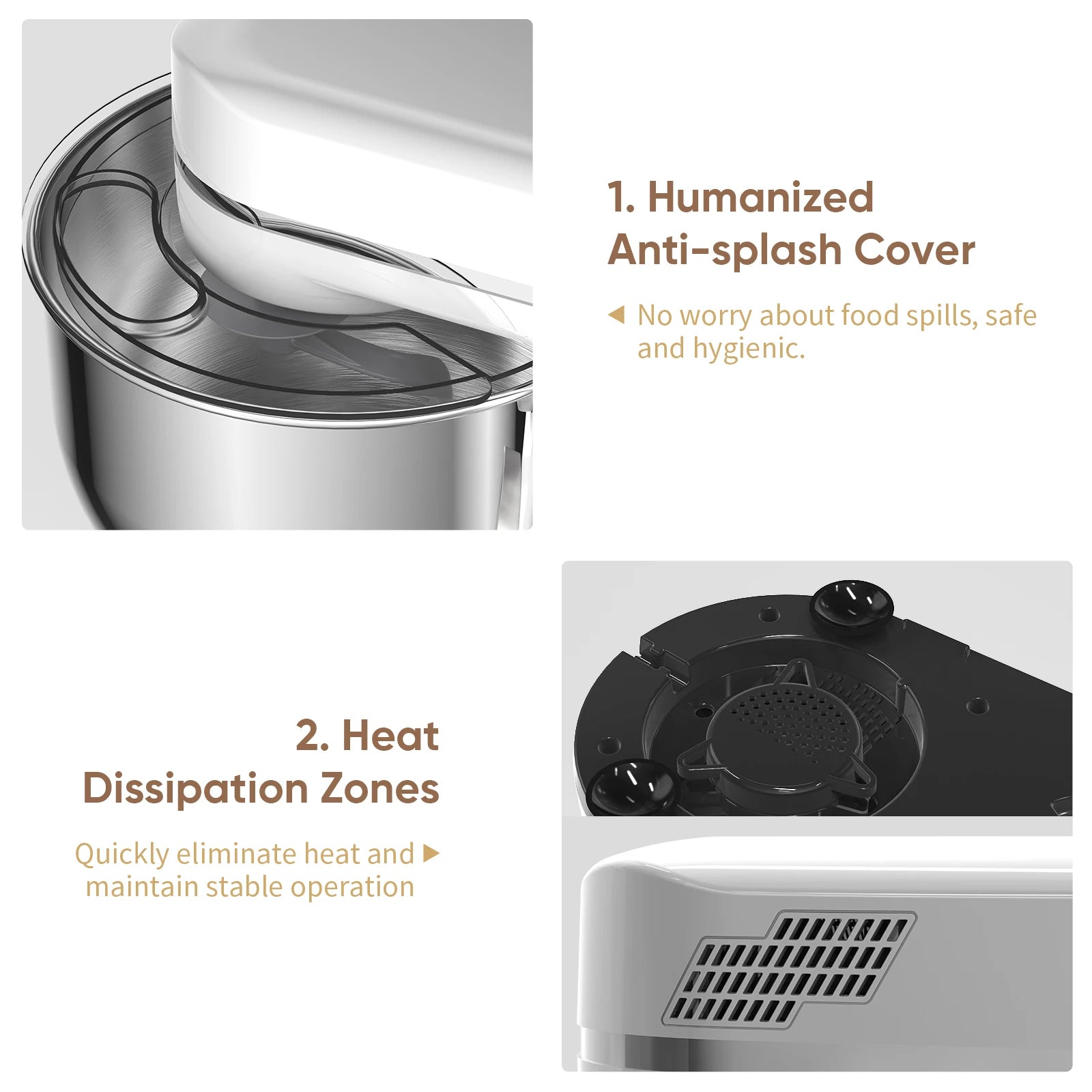 【5L Capacity】Stainless steel mixing bowl offers enough capacity. With a dough hook, flat beater, whisk, and pouring shield avoiding mess kneading process. Enjoy easy cleaning with dishwasher-safe parts, saving you time and effort. Perfect for baking for a family or a crowd.
