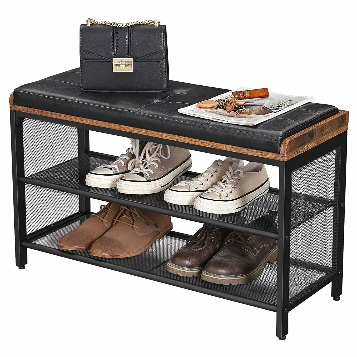 • Black Metal Entryway Shoe Rack Storage Bench with Padded Seat Cushion