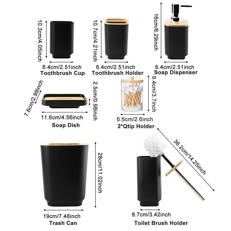 Bathroom accessories set This black/white bathroom accessories set contains 8 practical products to perfectly meet your daily needs.The set includes a toothbrush holder, toothbrush cup, lotion soap dispenser, soap tray, toilet brush, cotton swab box and trash can, providing a comprehensive bathroom finishing solution.Each product is made of high-quality plastic material, which is easy to clean and durable to help you keep your bathroom clean and orderly.The trash can has a simple design and is easy to use, adding a modern feel to your bathroom.