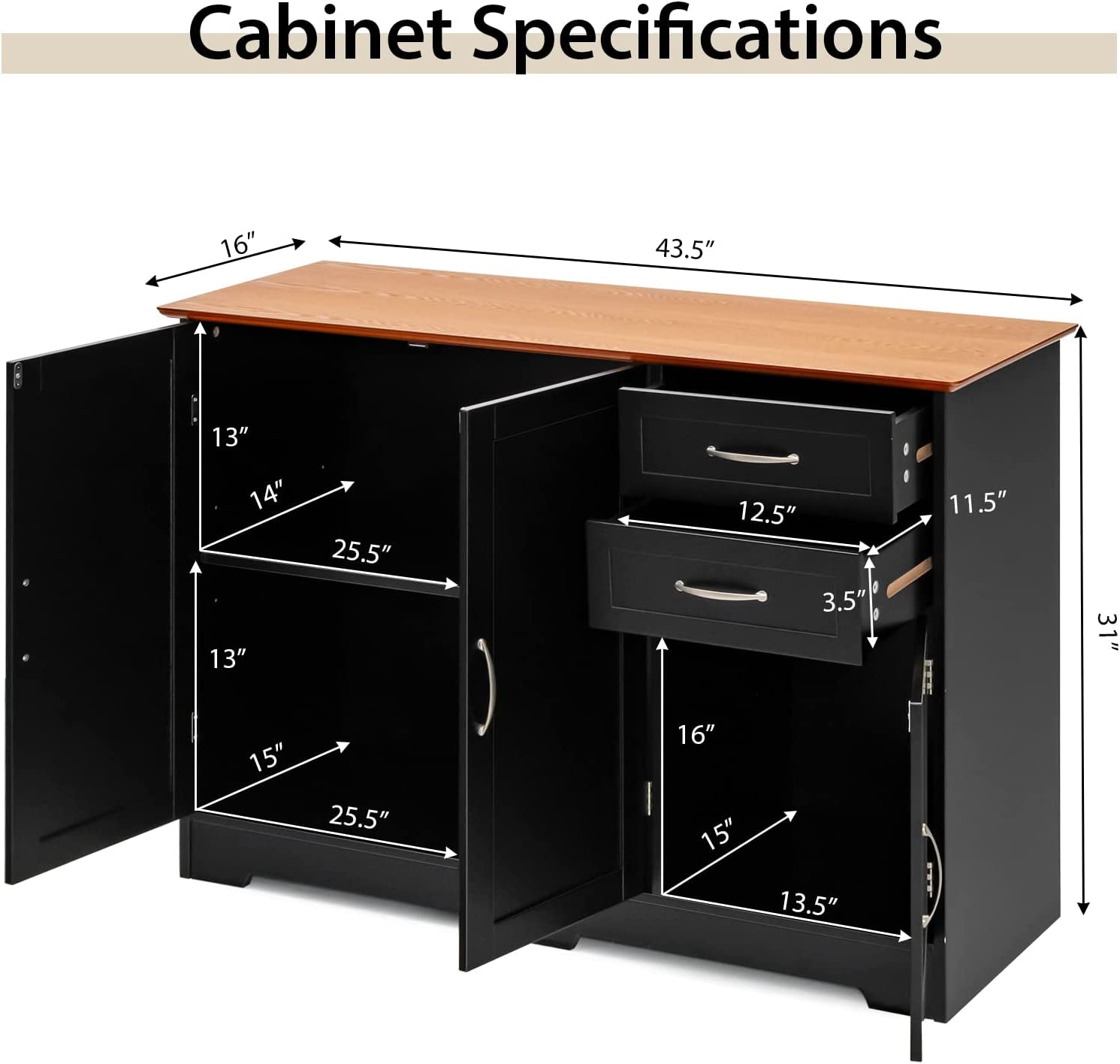 Inner Size of 2-Door Cabinet (Lower): 25.5" x 15" x 13" (L x W x H)