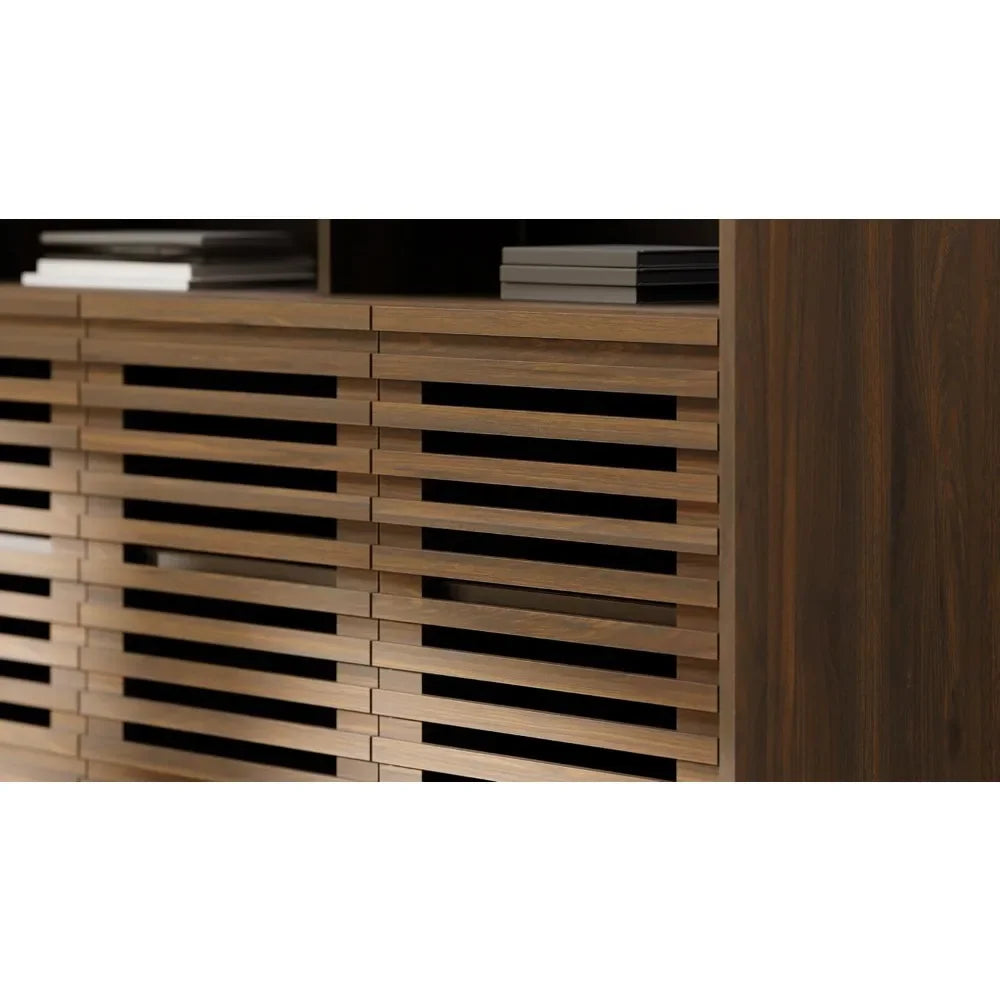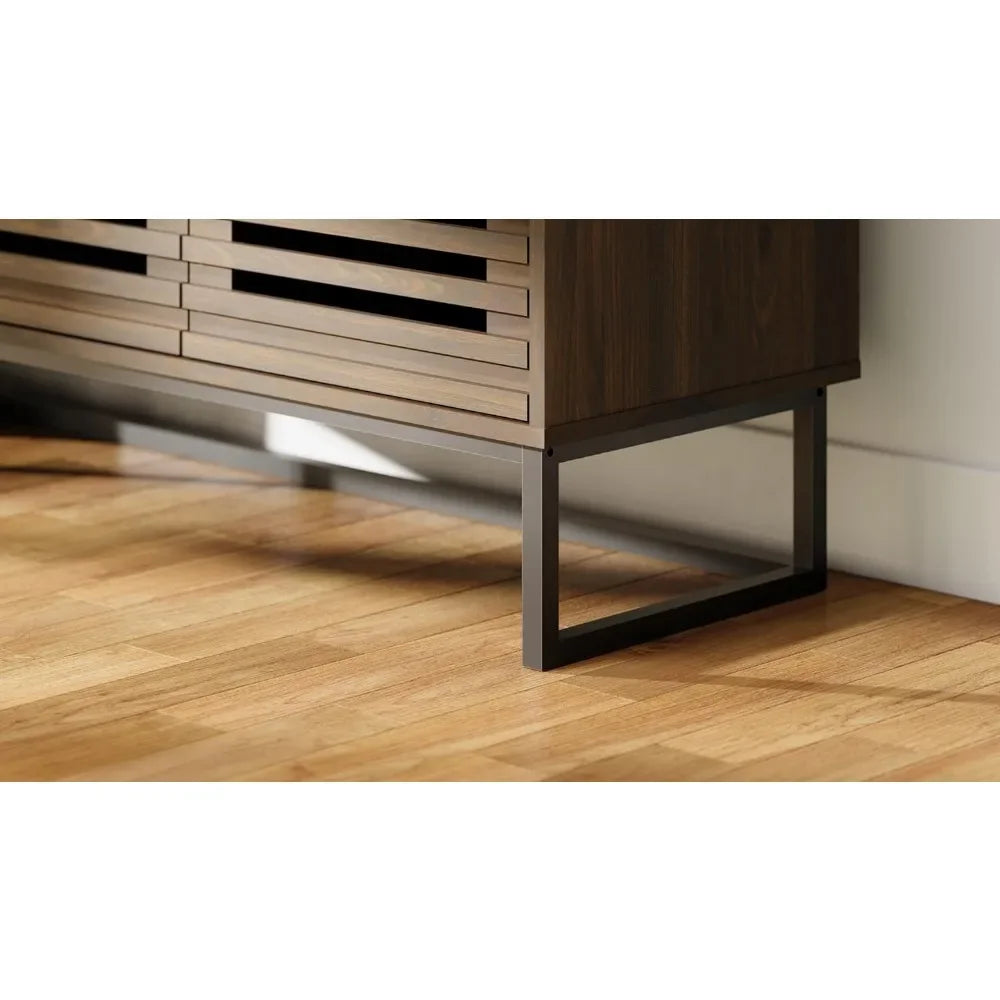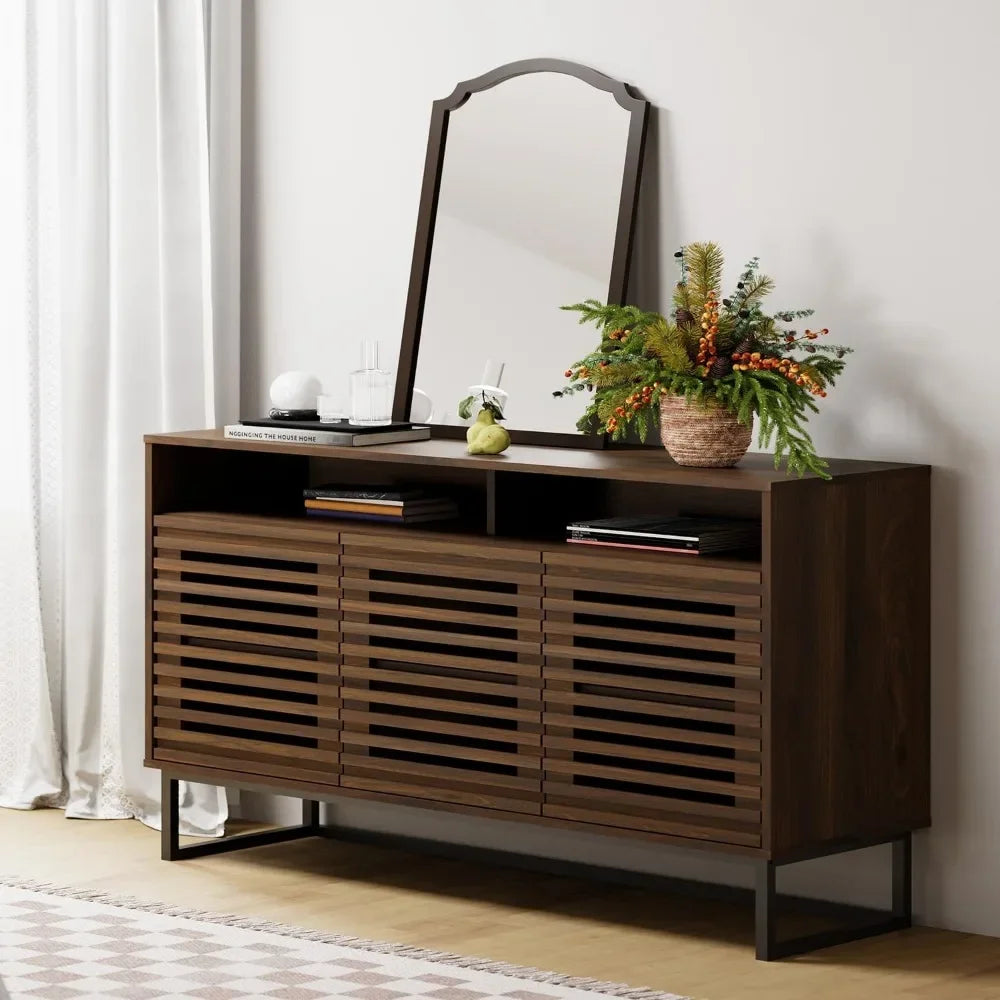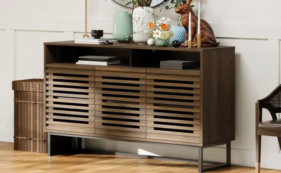 The distinctive louvered design provides partial concealment of the cabinet's contents, enhancing the neatness and order of the space.