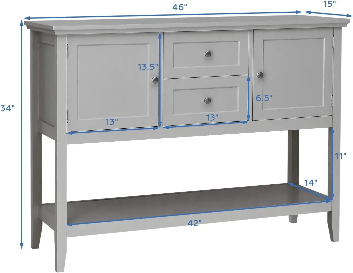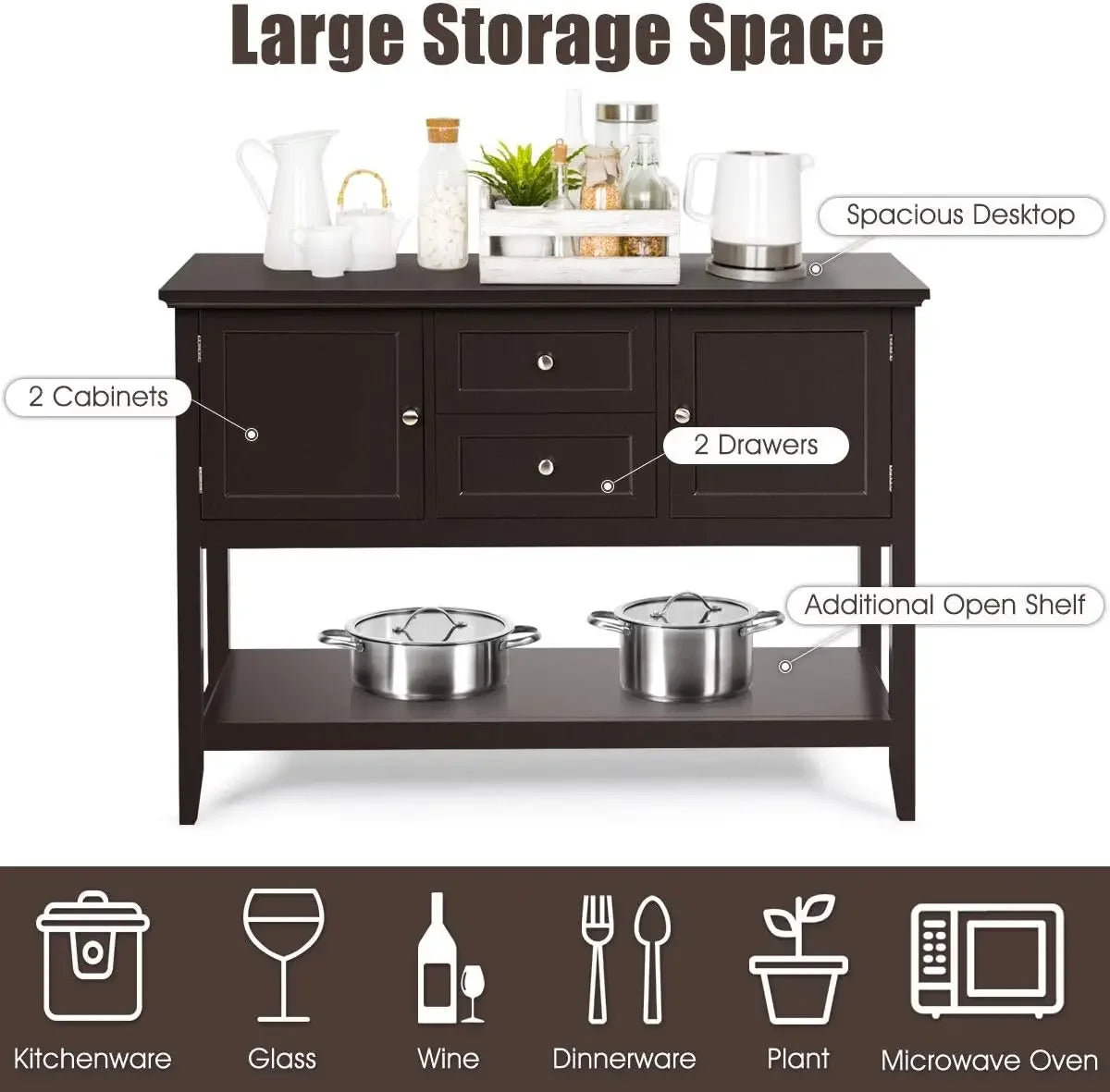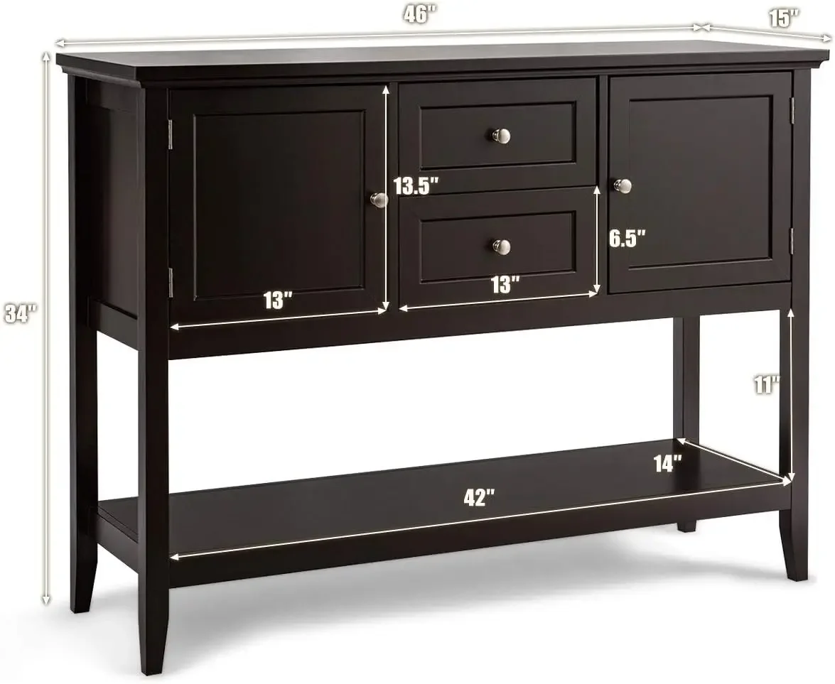 『Ample Storage Space』: This wooden sideboard is designed with 2 drawers and 2 cabinets, which provide you with ample storage space to classify and store different belongings. Besides, the top board and bottom shelf can display various items, such as fruit, tableware, plants, glassware, etc.