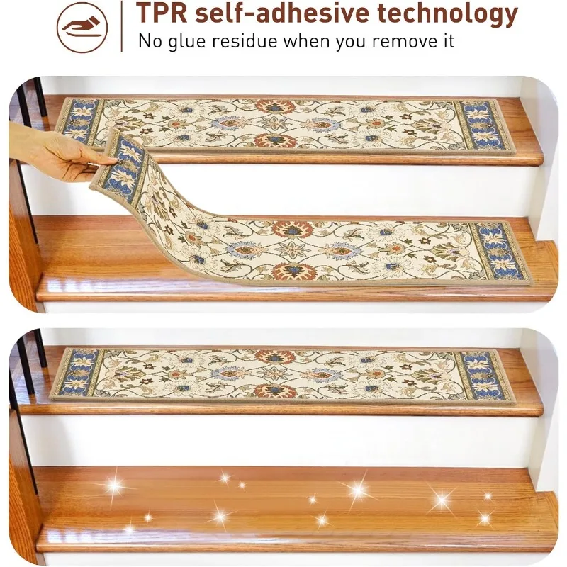 【Thickened self-adhesive base, Safe and non slip】The bottom is made of thickened non-slip backing and utilizes TPR self-adhesive technology. Whether it is wooden stairs or tile stairs, these indoor carpet stair treads can be firmly adsorbed. No residue of the adhesive after removal does not hurt the stairs.