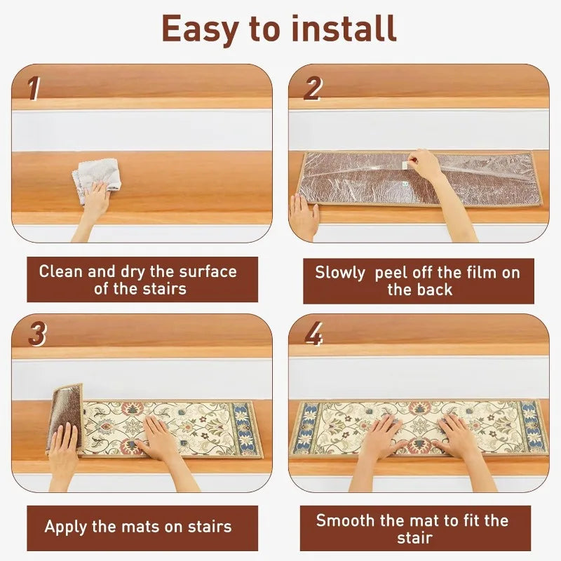 【Easy to install, No residue after removal】 Step 1, clean and dry the surface of the stairs. Step 2, Slowly peel off the film on the back. Step 3, apply the mats on stairs. Step 4, smooth the mat to fit the stairs. NOTE: To enhance adhesion, please dry the floor water before placing the mat and wait until the bottom is fully adsorbed to the floor.