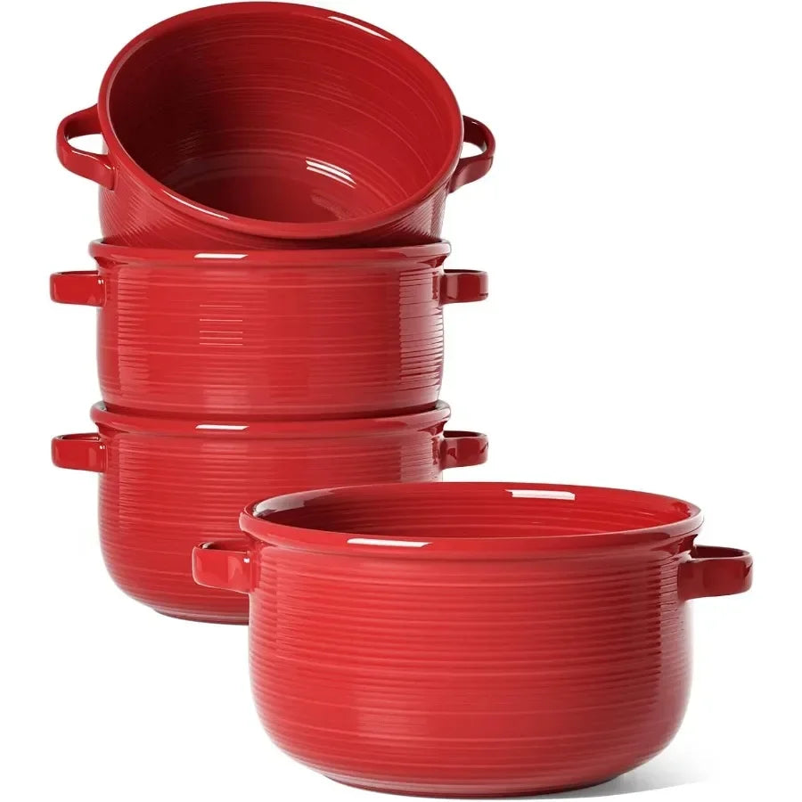 Stackable, Space-saving: Highly stackable and they cozy up comfortably in the cabinets; The glazed ceramic is resistant to odor and stains which can last for years; The glazed bottoms make these ceramic bowls easy to clean; Just put these onion soup bowls in the dishwasher