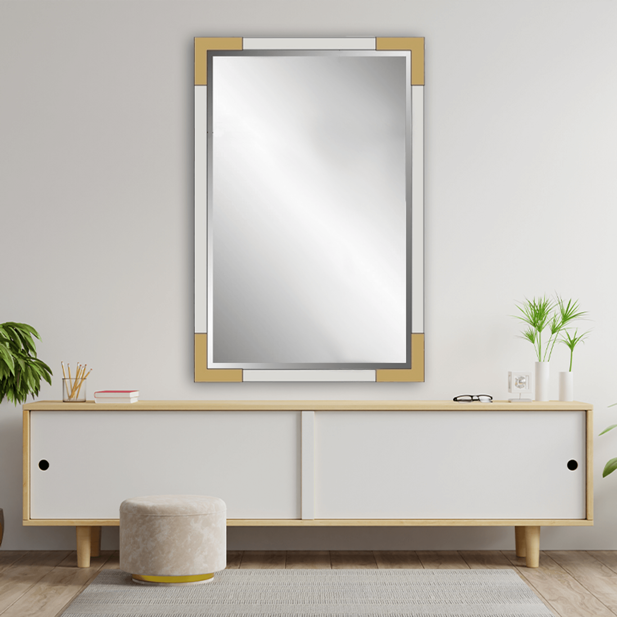 Introducing the Chloette Dual-Orientation Wall & Vanity Mirror, an exquisite addition to your home decor that combines functionality with sophisticated design. Crafted with a refined iron metal frame in an elegant silver finish, this mirror showcases gold corner caps that add a touch of luxury and visual interest.