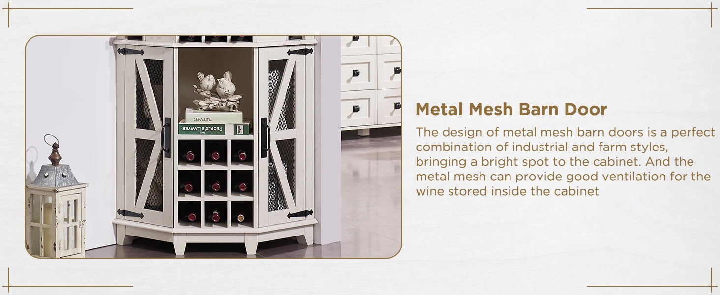 The black metal sheet decor adds a bit of retro accent to the whole wine cabinet, making it more chic