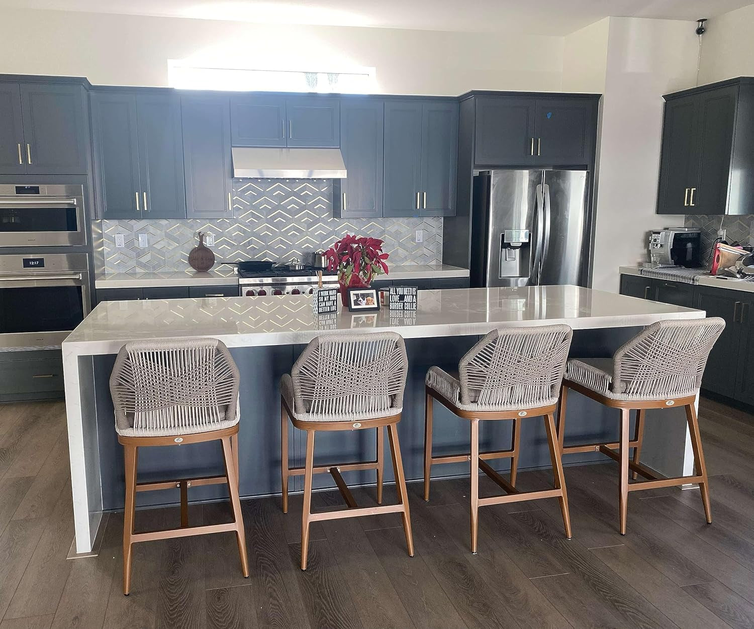 Enhance your outdoor spaces with the Stylish Rattan Counter Stools Set. This elegant set of four bar stools is designed to provide comfort and style in any setting, whether it’s your patio, garden, or pool deck.