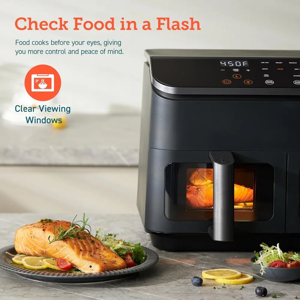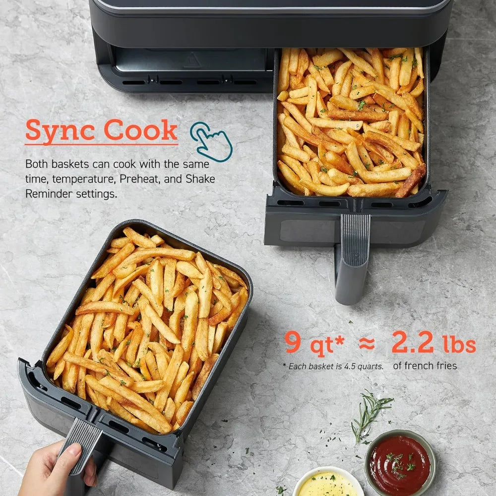 Adequate Cooking Space: This double basket air fryer features an impressive 9.0Qt capacity and two independent 4.5Qt cooking areas, making it your gateway to diverse culinary creations simultaneously.