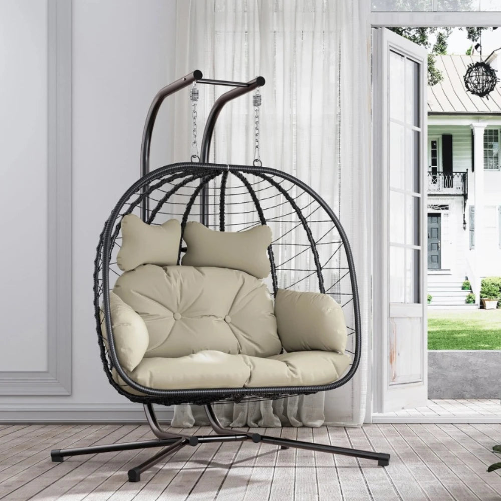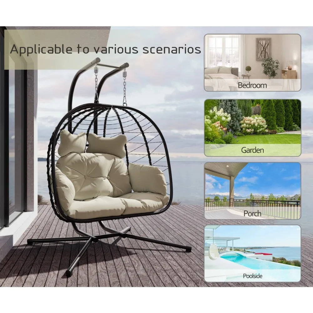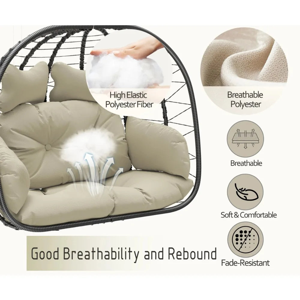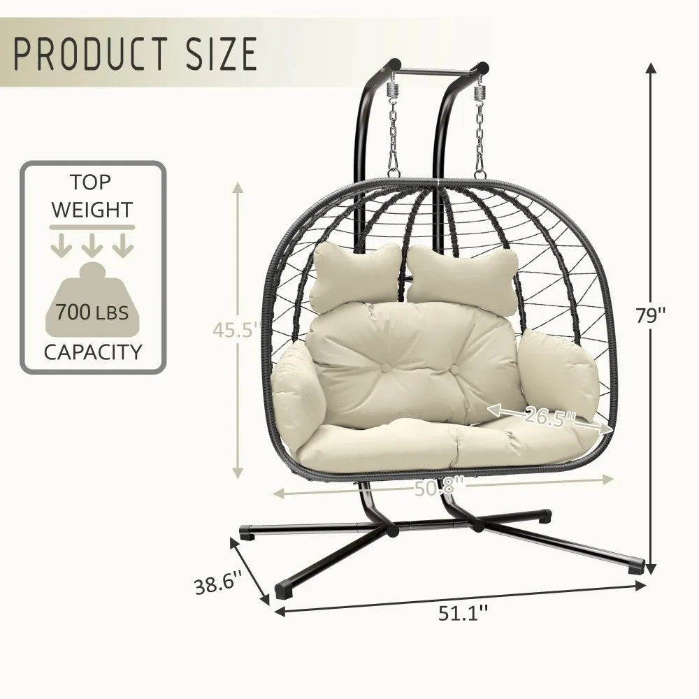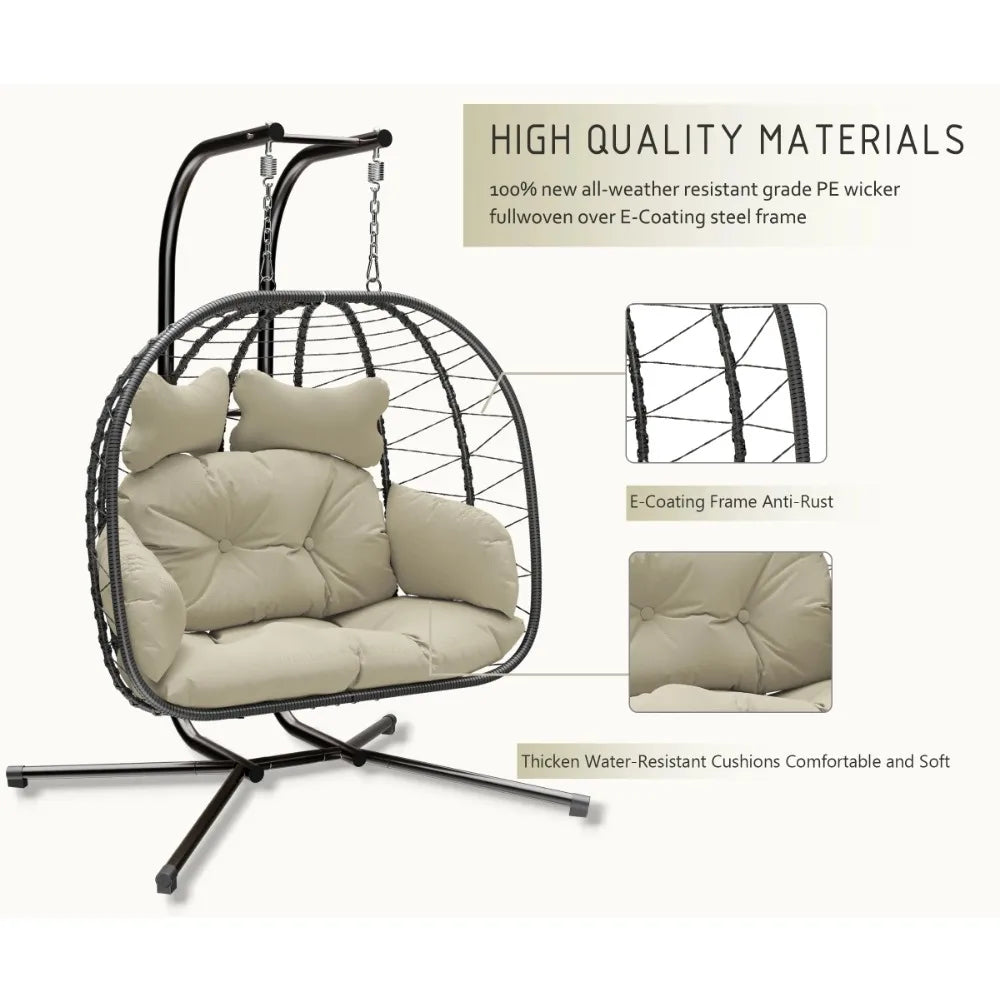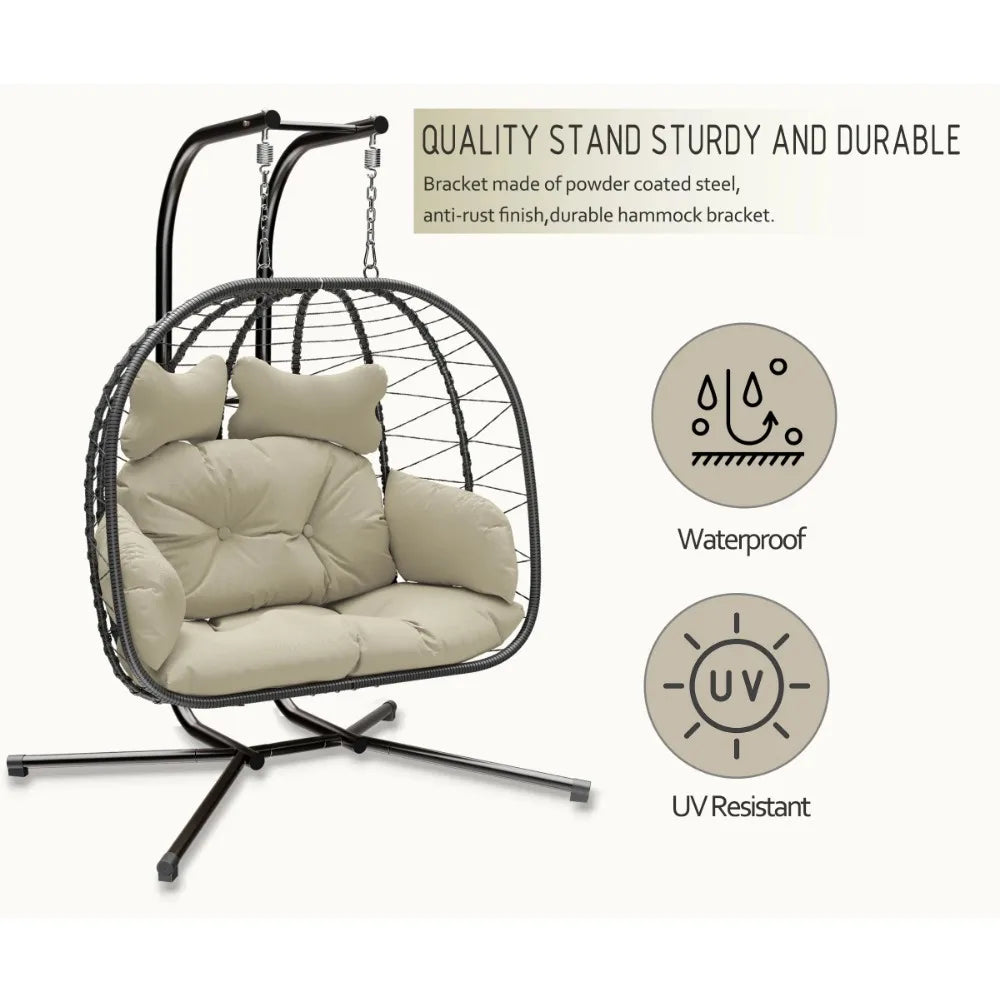 Double Wicker Swing Egg Chair Hammock Foldable Hanging Loveseat with Stand, UV Resistant Removable Cushions, 700LBS Capacity