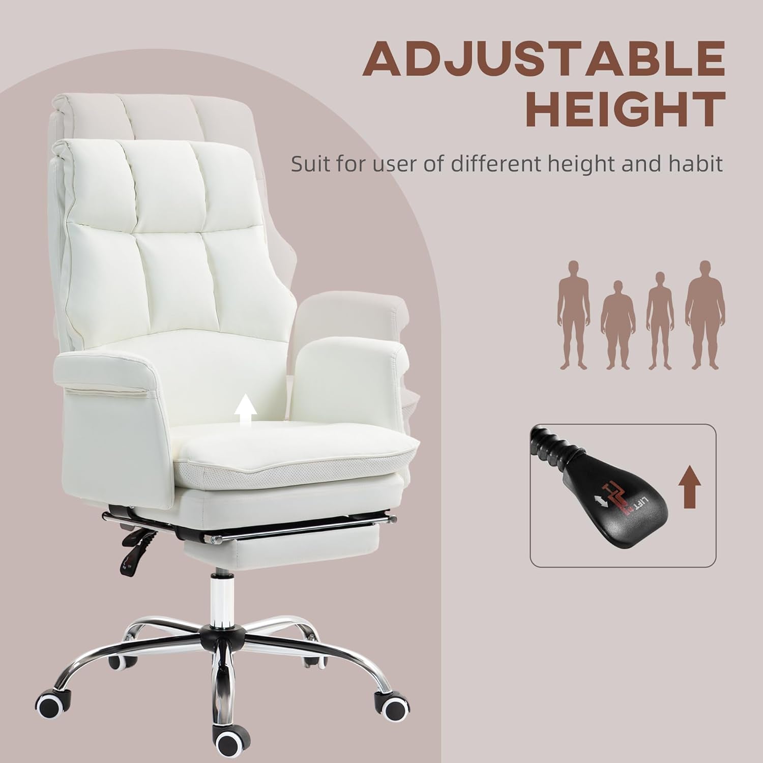 Transform your workspace with the HOMCOM home office chair. Enjoy customizable comfort with an adjustable seat height (19.7"-22.8"), a 155° reclining back, and a swivel seat. This comfy rolling chair features a retractable footrest, ensuring you stay supported during extended hours. Its sleek PU leather upholstery and metal base make this ergonomic chair a stylish addition to any office, gaming room, or study room.