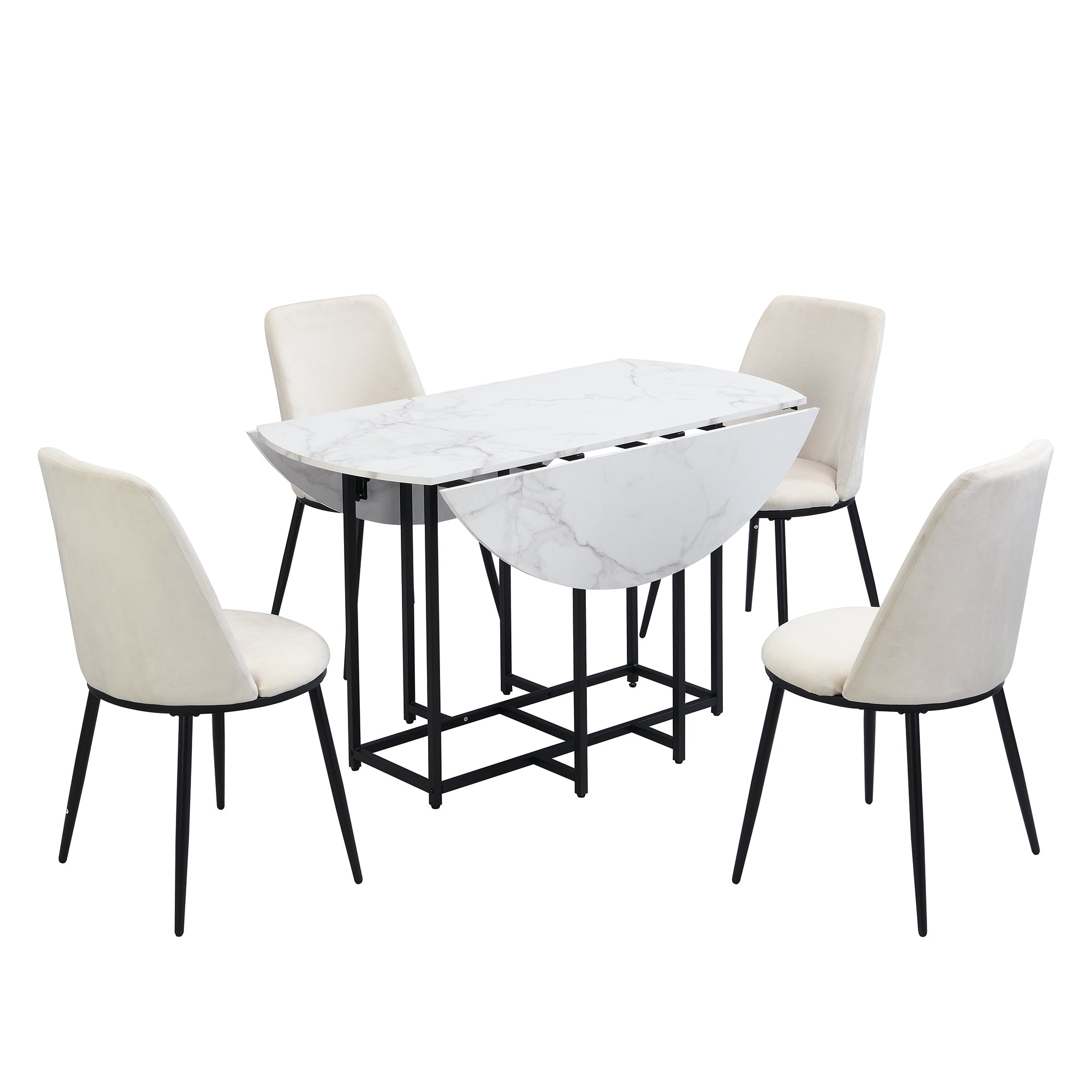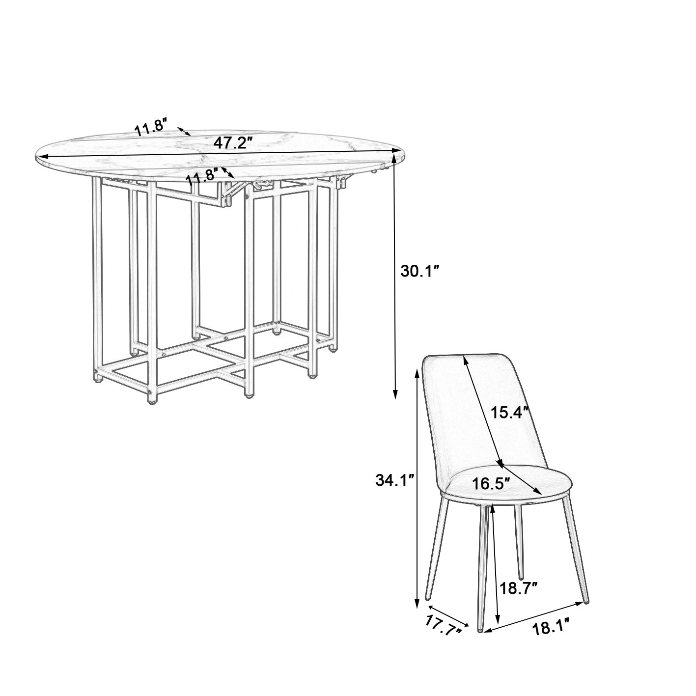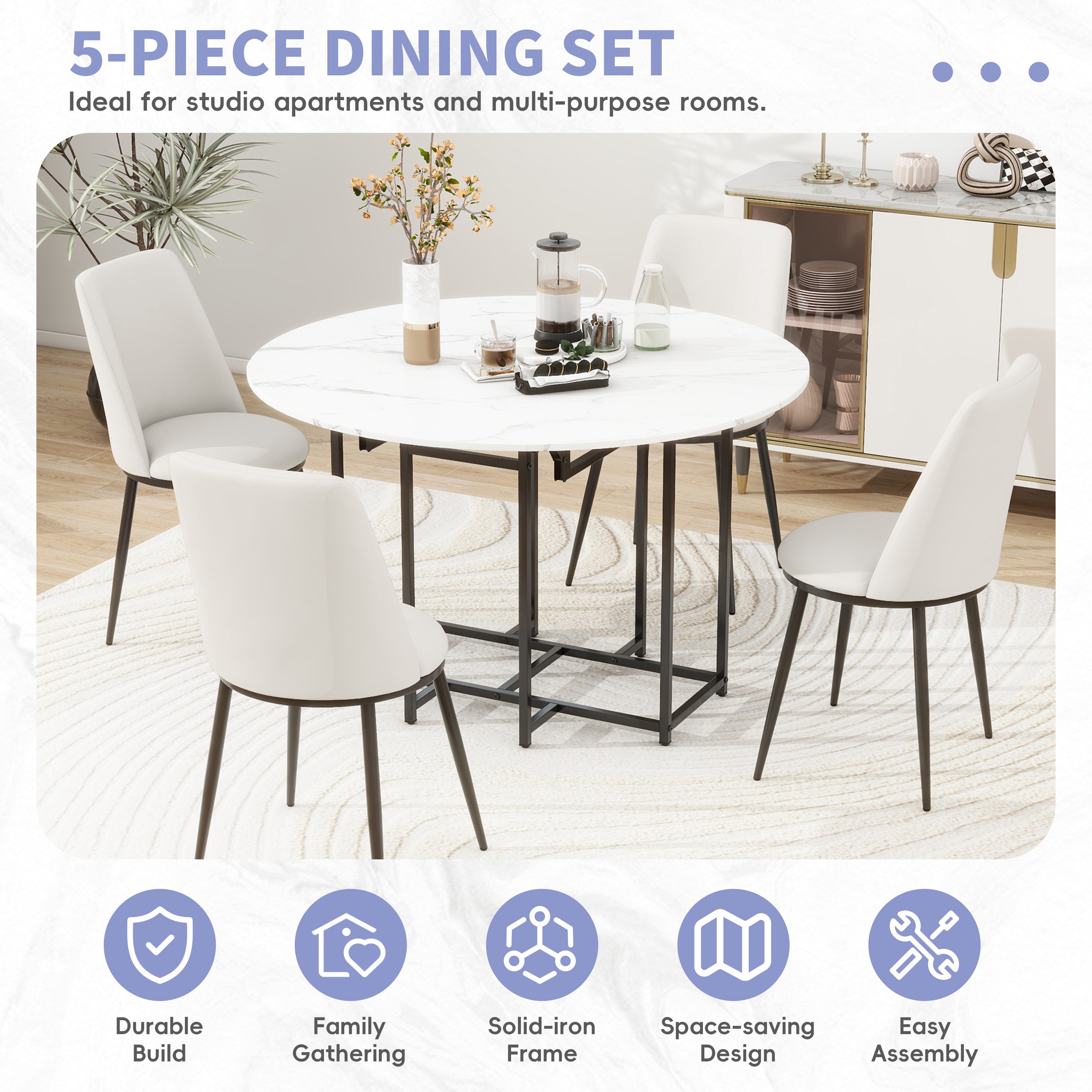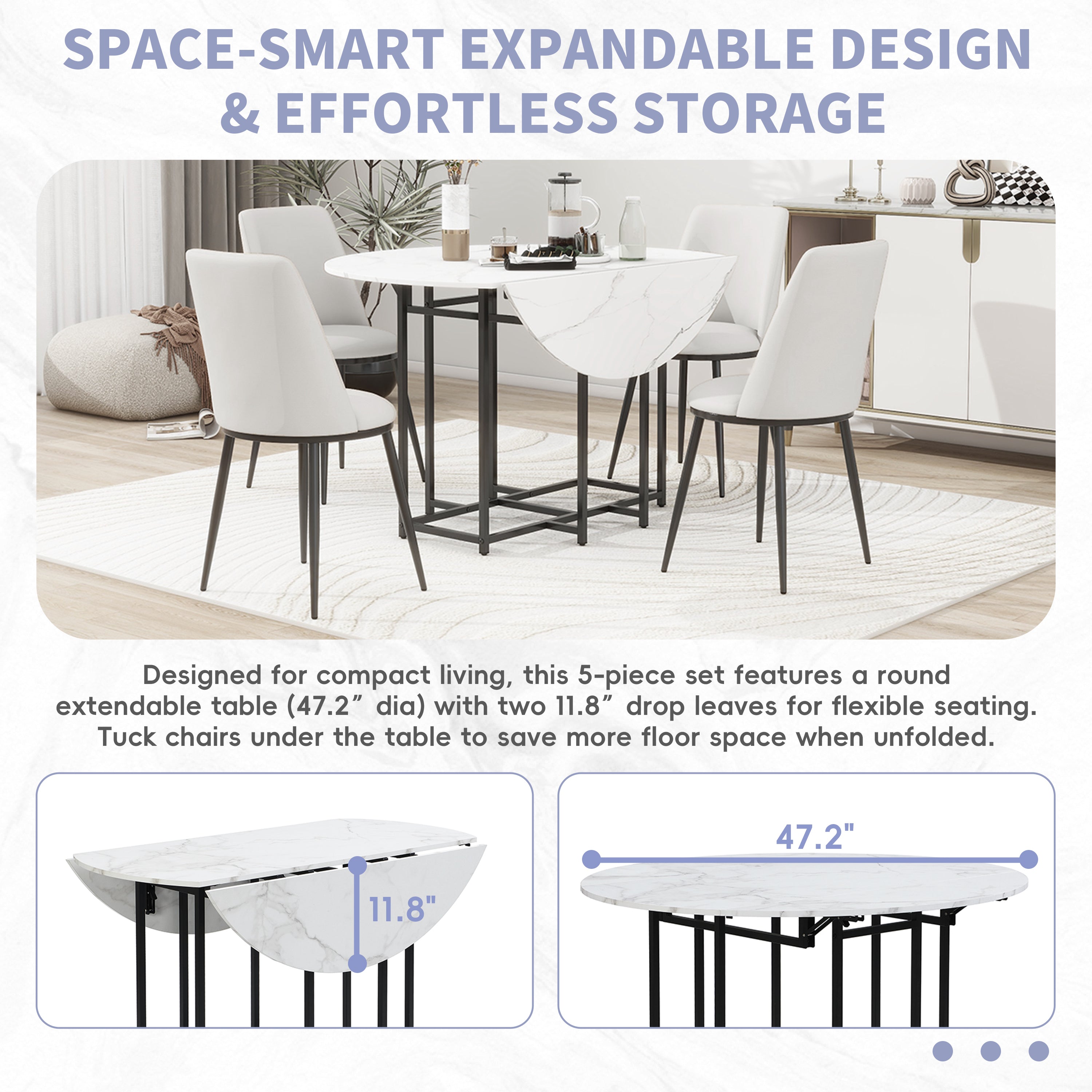 Summary | Maximize your compact living space with this versatile 5-piece dining set. The round extendable table (47.2” diameter) features two 11.8” drop leaves for flexible seating, paired with a sleek faux marble white top and golden iron frame. Four ergonomic upholstered chairs with full back support and adjustable foot pads ensure comfort. Ideal for apartments and studios, the foldable design ships in two boxes for easy assembly. Choose from three modern colors. Weight capacity: 264lbs per chair, 176lbs for the table. |