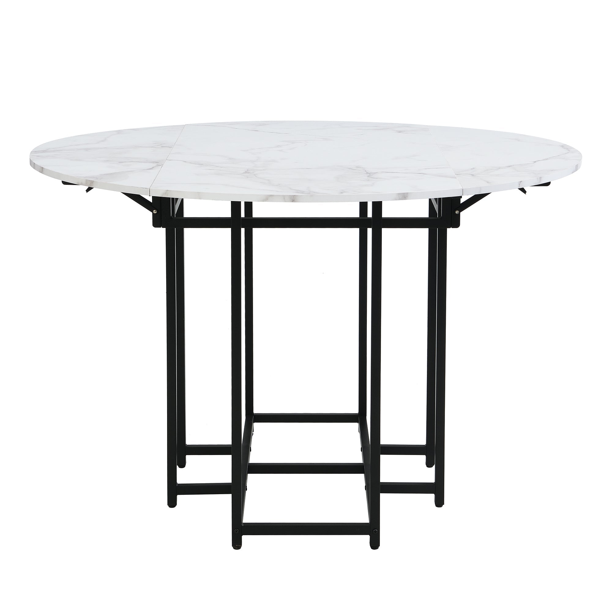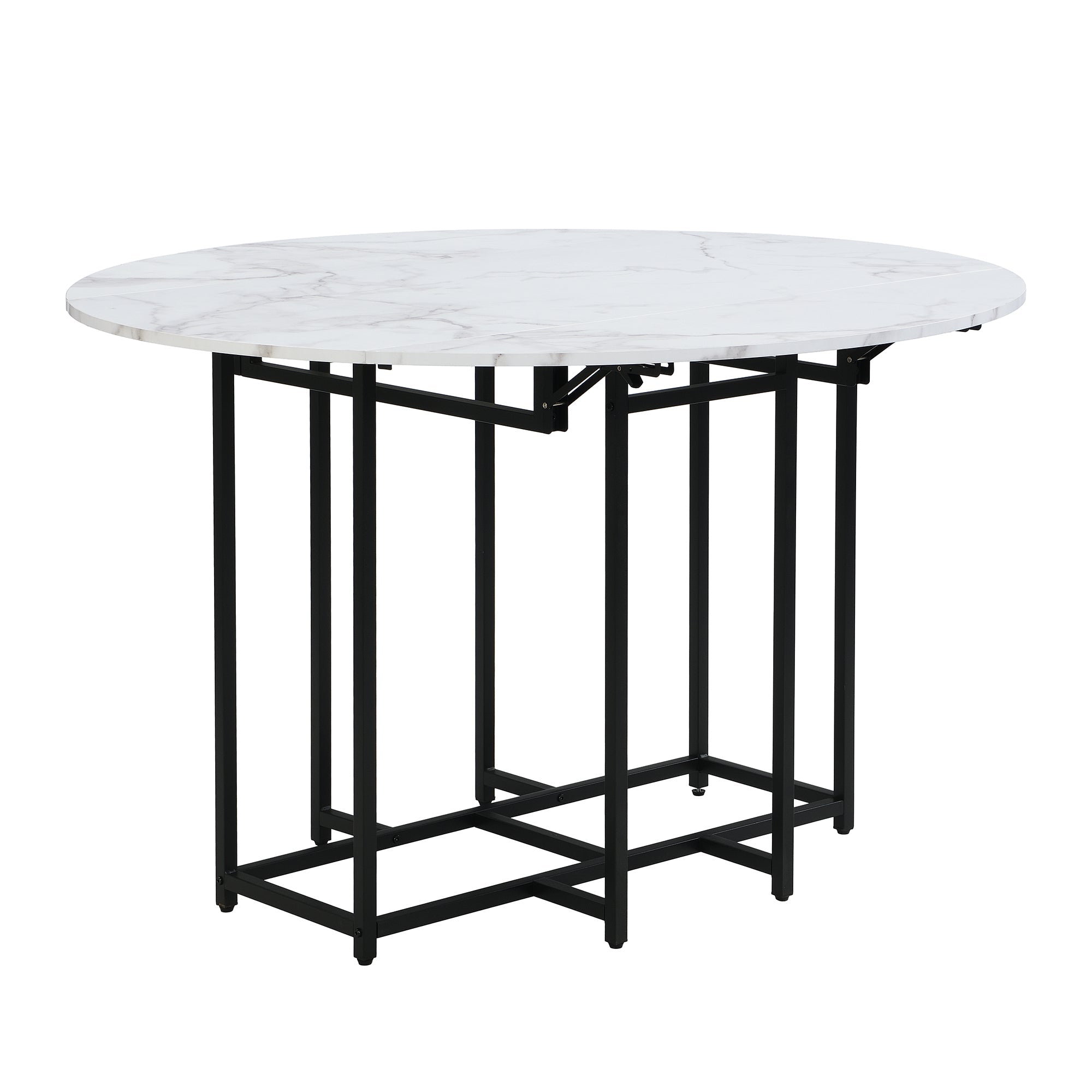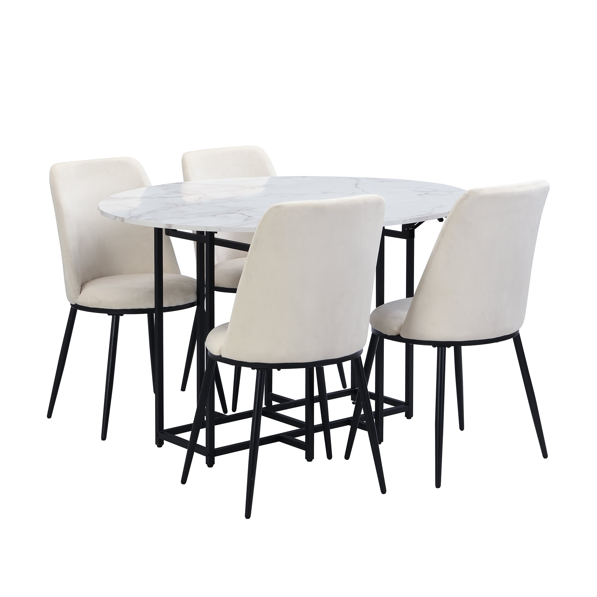 Summary | Maximize your compact living space with this versatile 5-piece dining set. The round extendable table (47.2” diameter) features two 11.8” drop leaves for flexible seating, paired with a sleek faux marble white top and golden iron frame. Four ergonomic upholstered chairs with full back support and adjustable foot pads ensure comfort. Ideal for apartments and studios, the foldable design ships in two boxes for easy assembly. Choose from three modern colors. Weight capacity: 264lbs per chair, 176lbs for the table. |