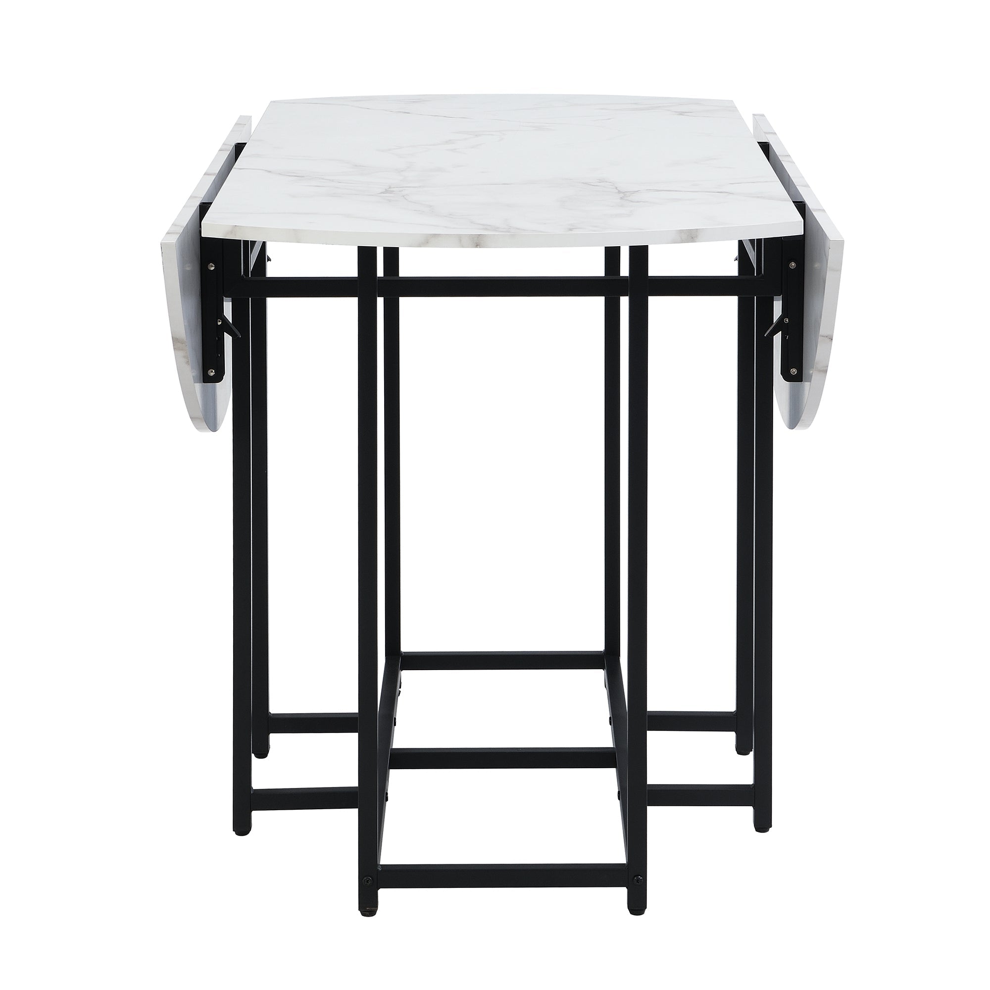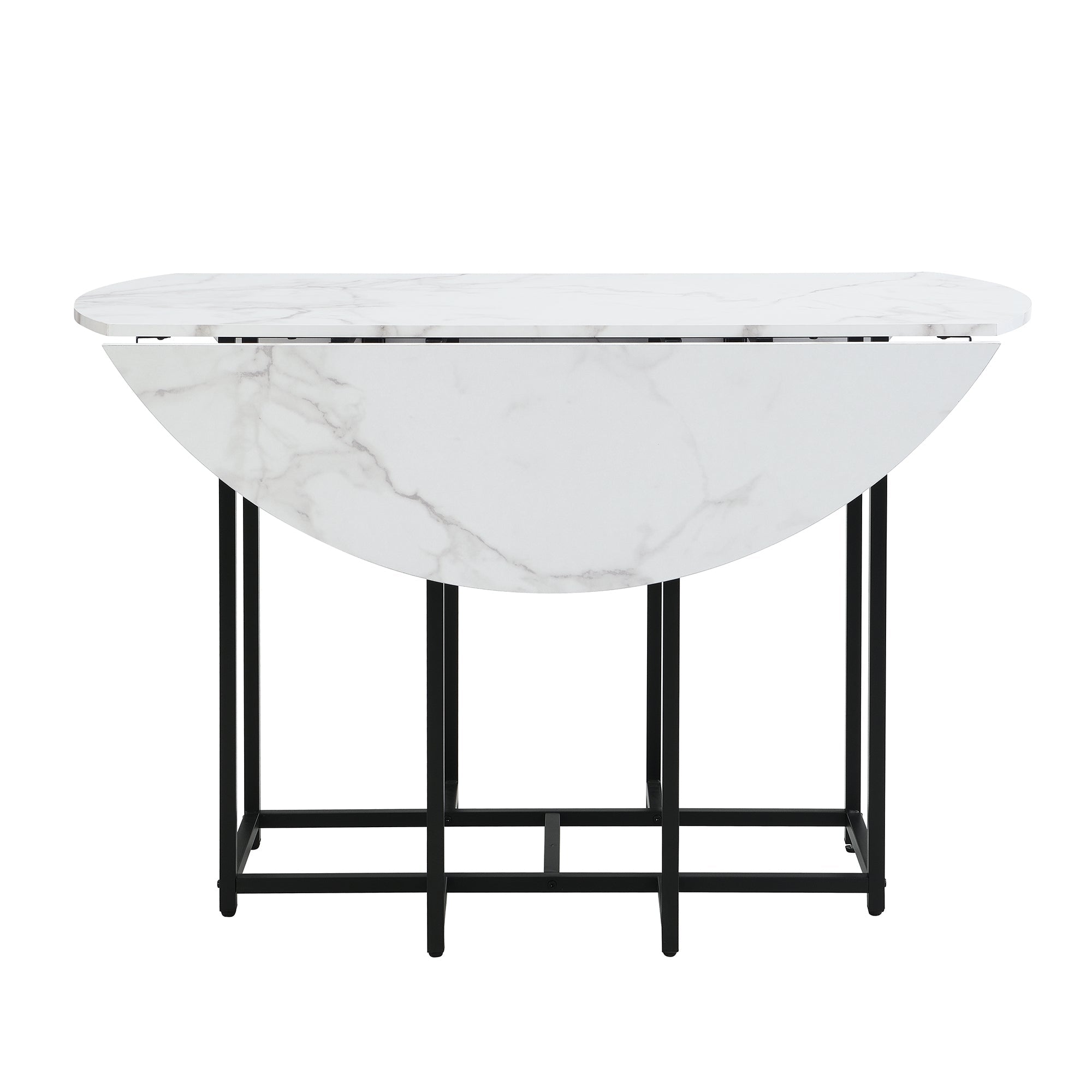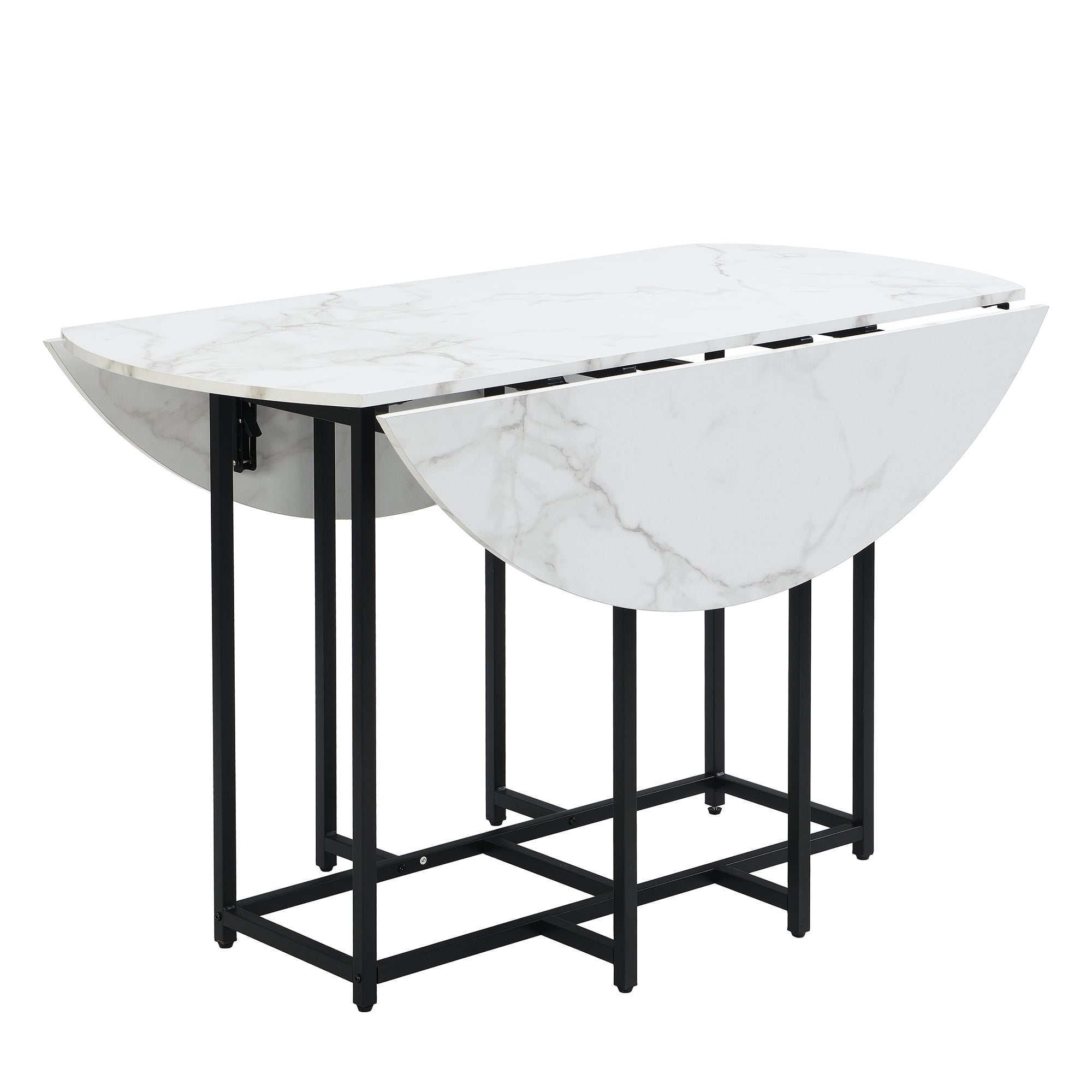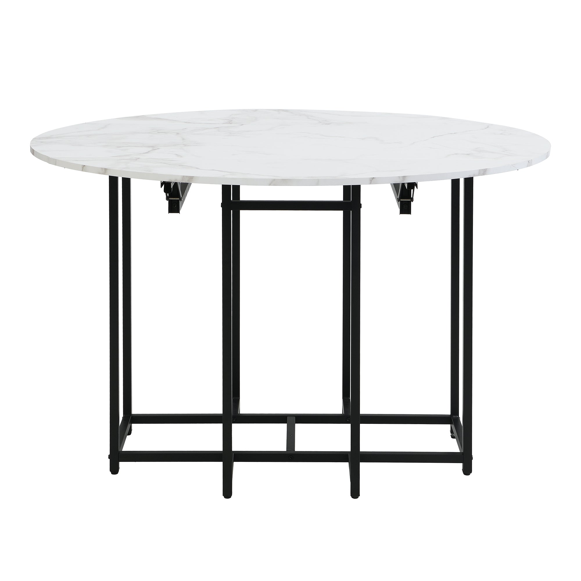 Summary | Maximize your compact living space with this versatile 5-piece dining set. The round extendable table (47.2” diameter) features two 11.8” drop leaves for flexible seating, paired with a sleek faux marble white top and golden iron frame. Four ergonomic upholstered chairs with full back support and adjustable foot pads ensure comfort. Ideal for apartments and studios, the foldable design ships in two boxes for easy assembly. Choose from three modern colors. Weight capacity: 264lbs per chair, 176lbs for the table. |