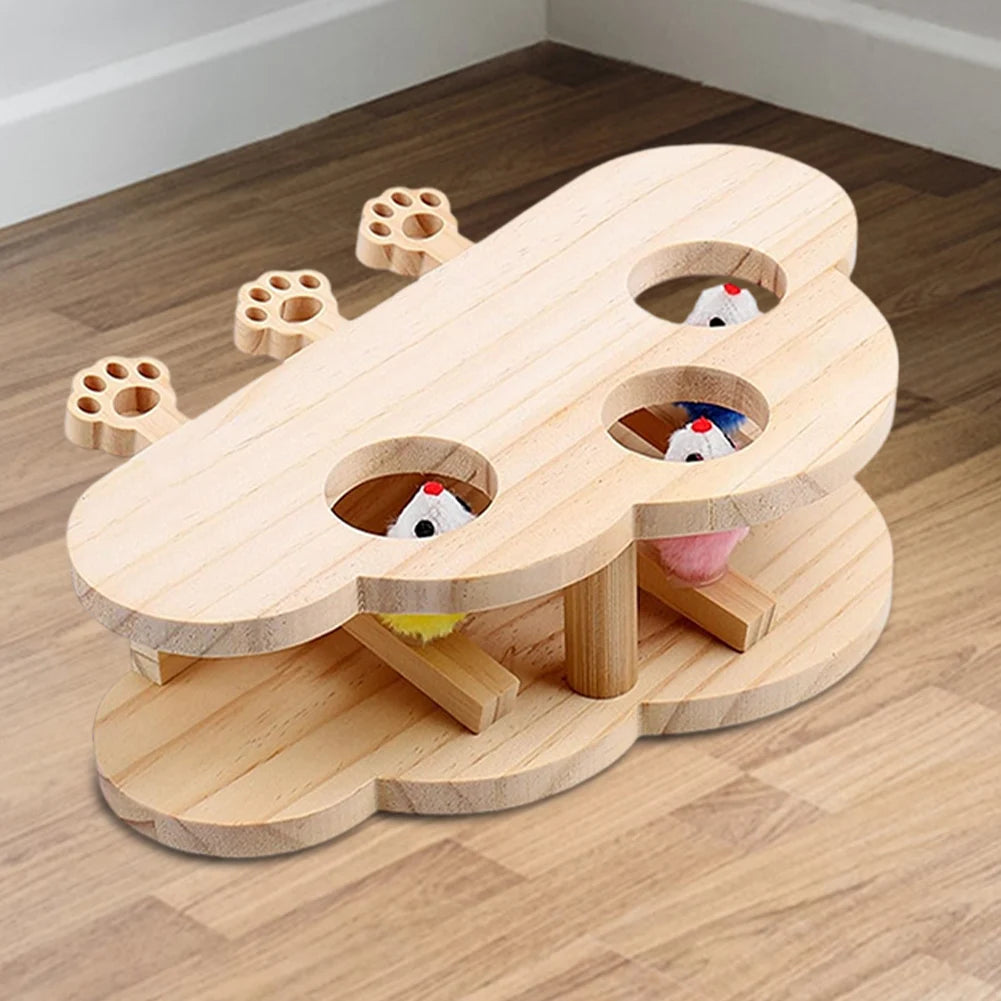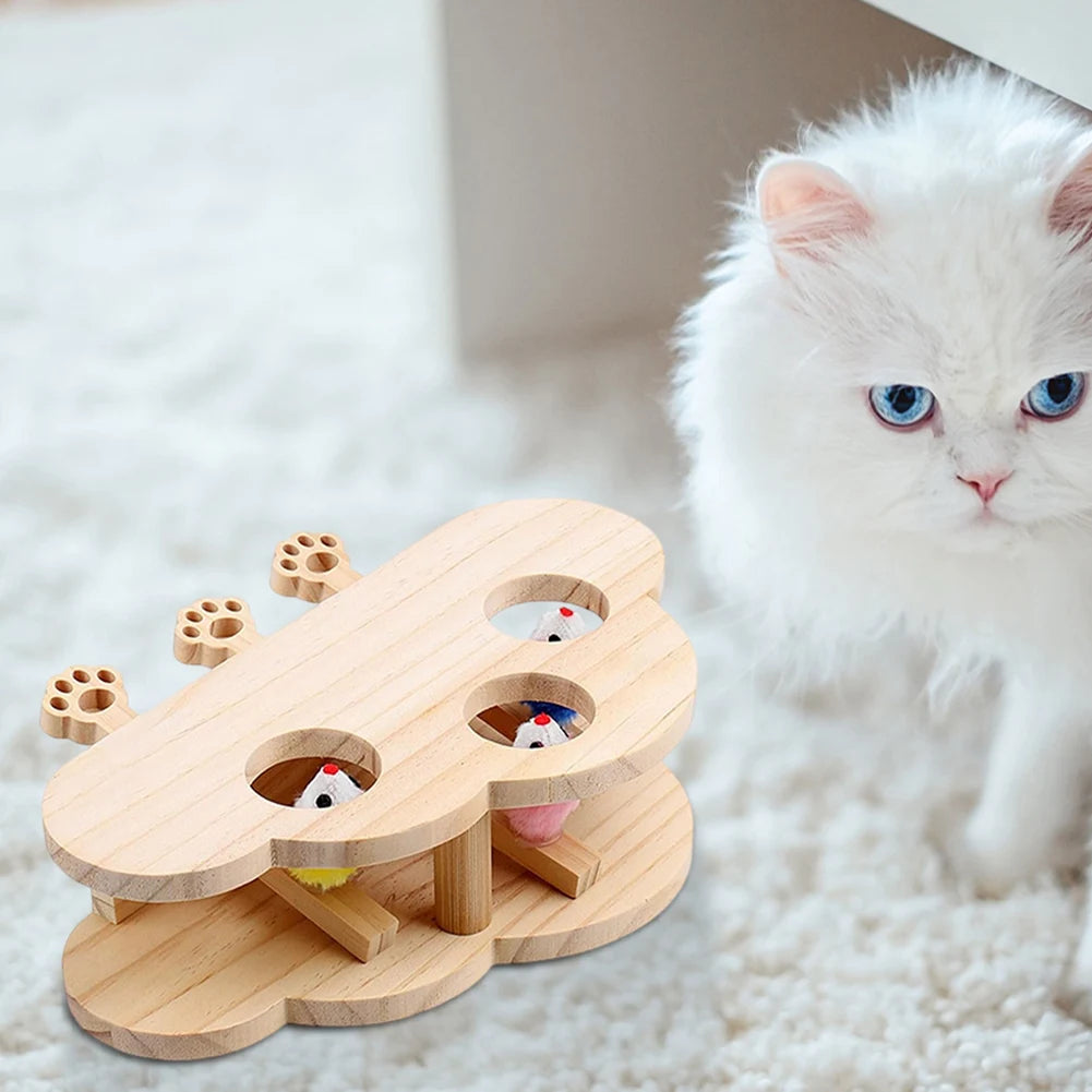 1. Interactive Play Experience: This cats whack a mole game mimics the classic cat-and-mouse game, sparking your cat's curiosity and encouraging playful interaction. It strengthens the bond between pet and owner while promoting exercise for a healthier lifestyle. Specification: Origin: USA Material: Wood, Plush Size: 305.00x240.00x105.00mm/12.01x9.45x4.13inch