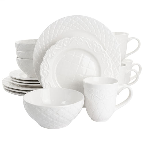 Nothing speaks comfort like the Gibson Home Quilted Eyelet 16 Piece Round Fine Ceramic Dinnerware Set in White. Boasting a charming quilt like pattern, this table setting suits any home kitchen table. The fine ceramic material allows the plates to be dishwasher safe for easy cleaning and microwave safe for fast reheating. Enjoy seconds and thirds with the whole family. The set is perfect for any occasion, from quick lunches to celebratory dinners.