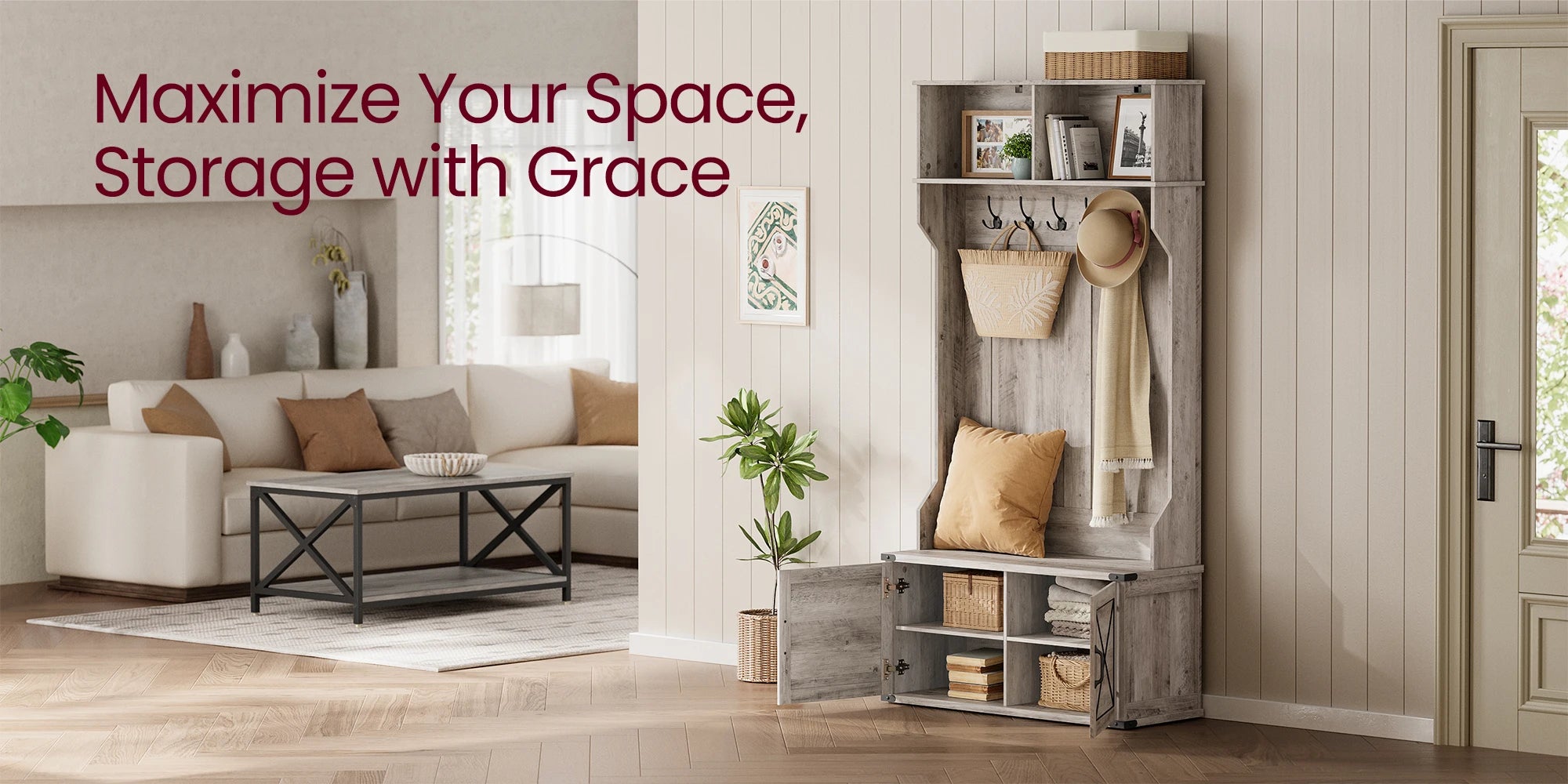 [Farmhouse Style] The hall tree adds a touch of farmhouse charm into your home