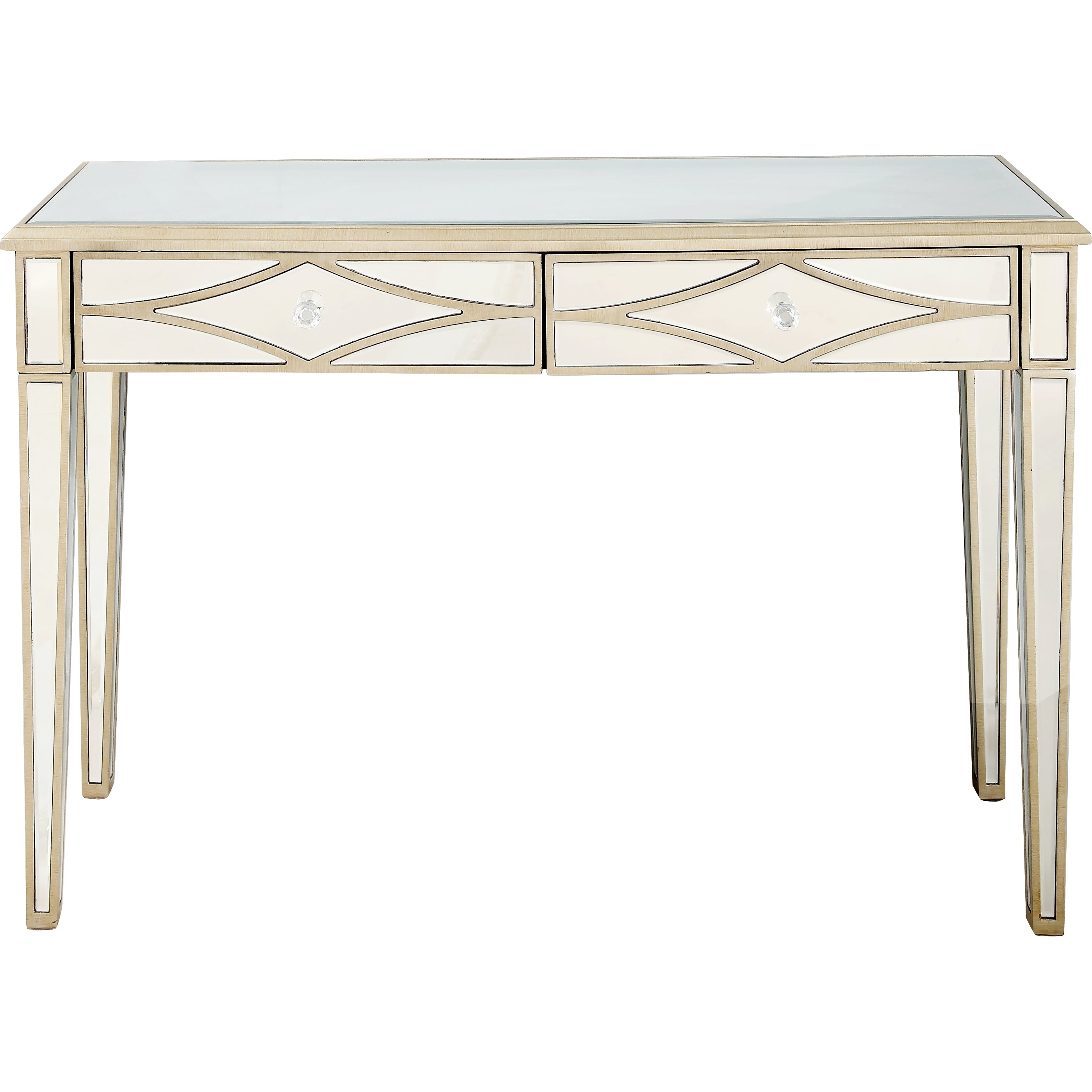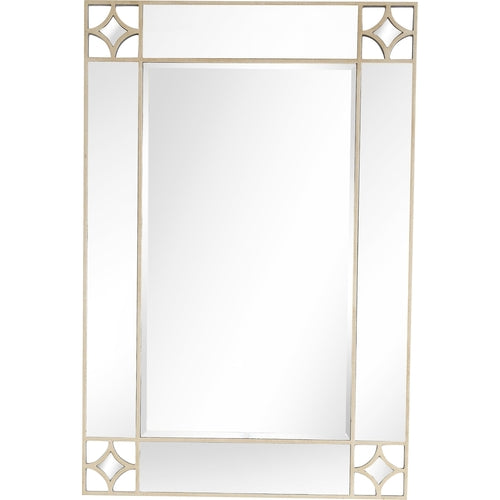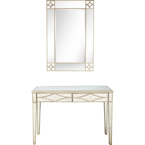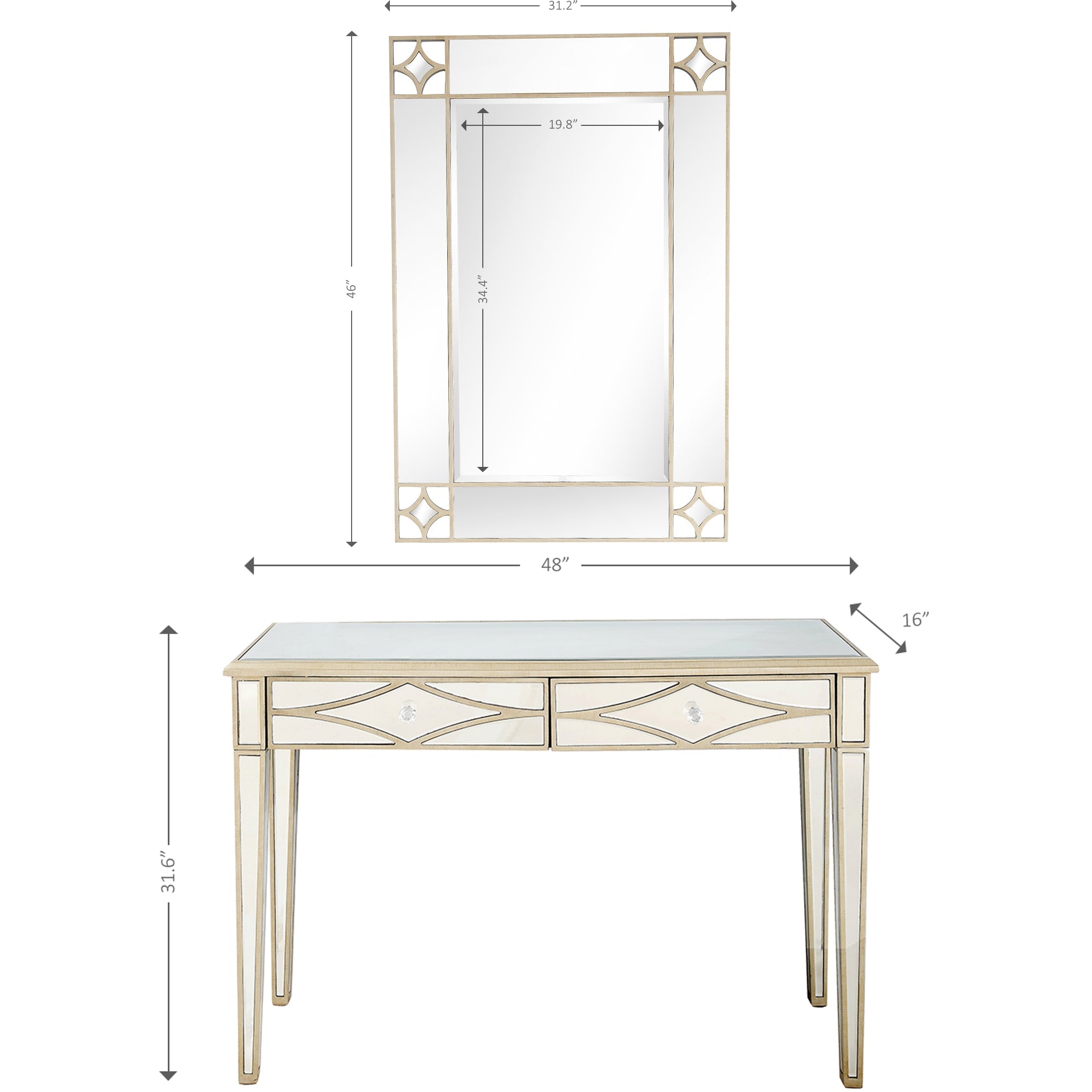 Sophistication and elegance are what make the beautiful Huxley Mirror Console a great addition to your entryway and foyer. Crafted of mirrored panels with beveled edges, this console opens up space and sits decoratively in any room. Its champagne finish and crystal knobs give it a regal appearance that looks good with both modern and contemporary designs. For an easy and elegant update to your interior design, Huxley Beveled Accent Mirror is a perfect choice! Diamond-shaped embellishments on the corners with a champagne frame add an interesting touch to your modern living space. Pair it with faux antlers to create a unique look or use two in a row to add a touch of brightness in your room. Beveled 31.2 x 46 mirror has a high quality silver backing. Ready to hang either vertically or horizontally with pre-attached hanging mounts.
