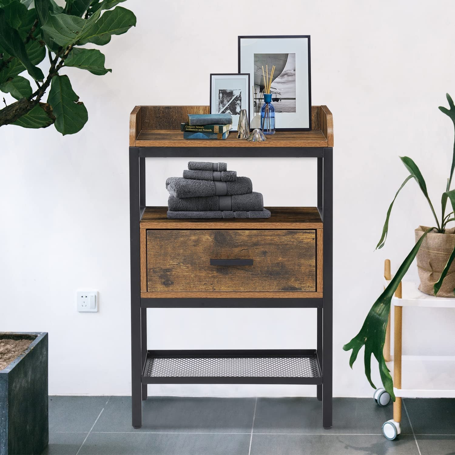 The nightstand has a drawer and two open shelf which provide ample storage space for your items. And featuring an industrial design and wood grain, this nightstand has a unique look that will blend in with any home decor. It can be used as a nightstand, end table or side table in the bedroom, living room and more.