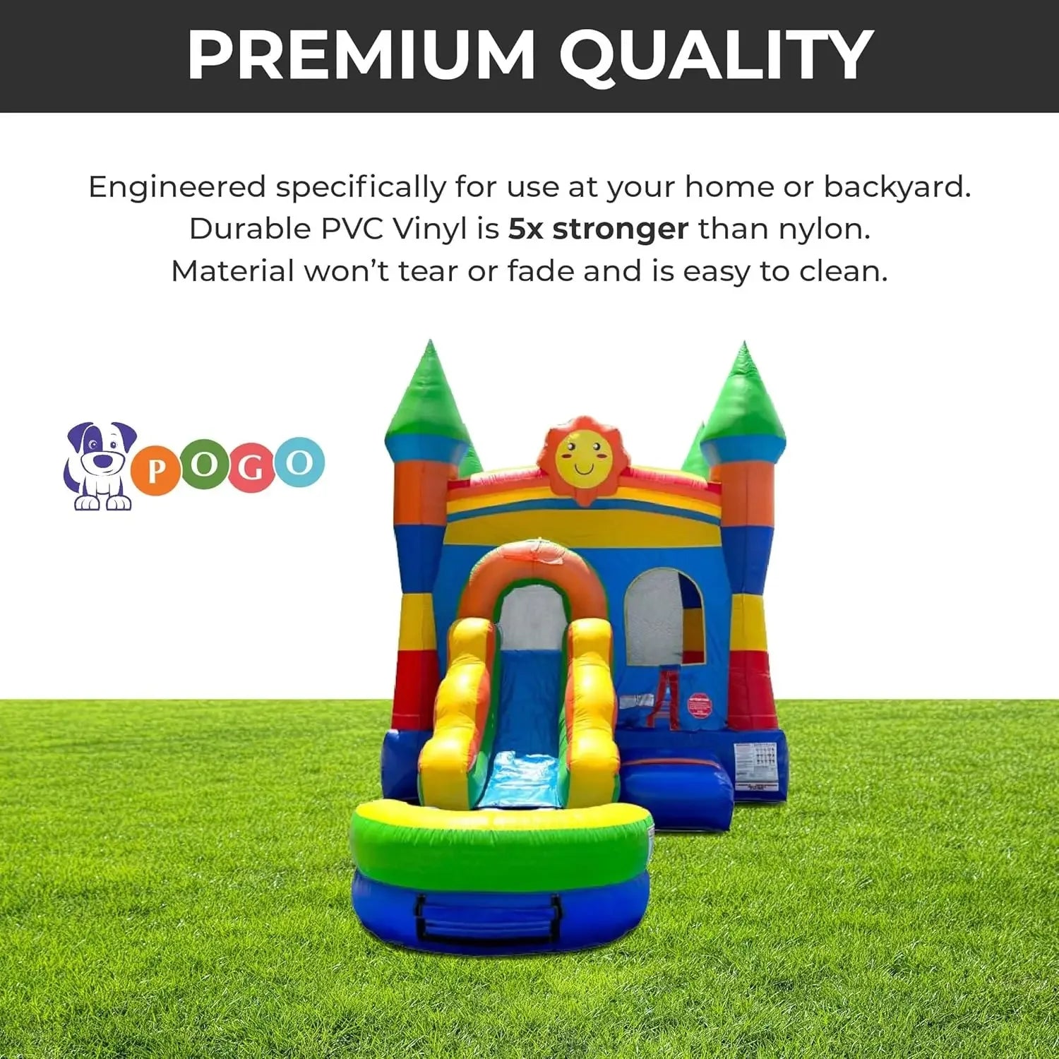 • PREMIUM BUILD: All of our bouncy houses feature commercial grade manufacturing. Bring premium fun to your backyard. We've used rental grade PVC vinyl construction that is stronger than nylon. All high-stress areas are made of industrial-strength, 15-ounce heavy-duty, multilayer Vinyl with double to quadruple stitching. This includes the bouncing surface, mattress sides, bottom, and slide surface.