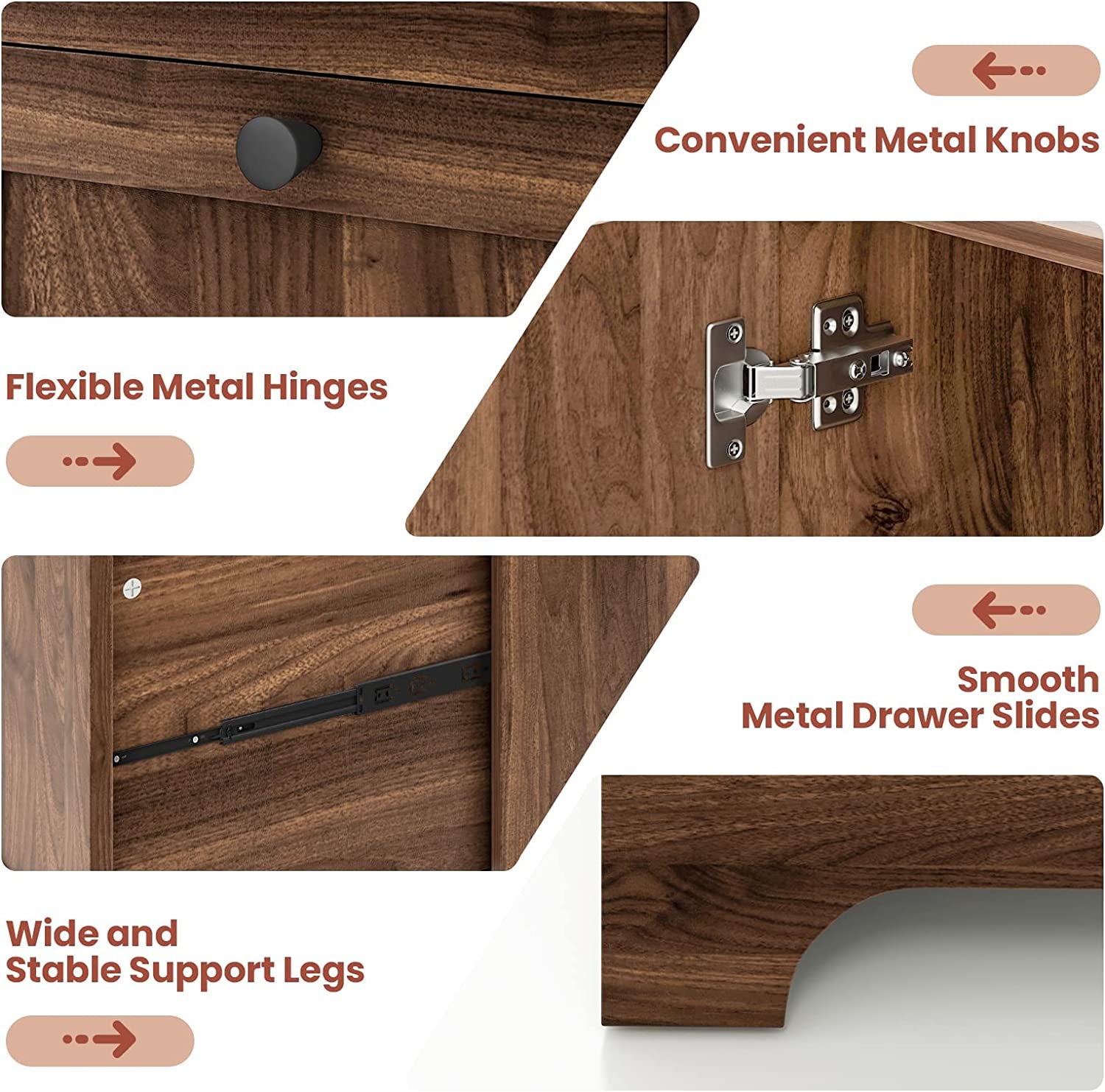 Are you looking for a desk that is both practical and stylish to meet your diverse needs? Well, why not try this one! Designed with a spacious desktop, 2 large drawers, a door cabinet and a slide-out keyboard tray, this L-shaped corner desk offers ample storage space to well organize your office supplies, ideal for any corner of your room, making the most of your limited space, providing you with more studying and working areas. In addition, convenient metal knobs and smooth metal drawer slides make it easy for you to open and close the drawers. It's classic appearance and space-saving design is perfect for your living room, bedroom, study room and home office.